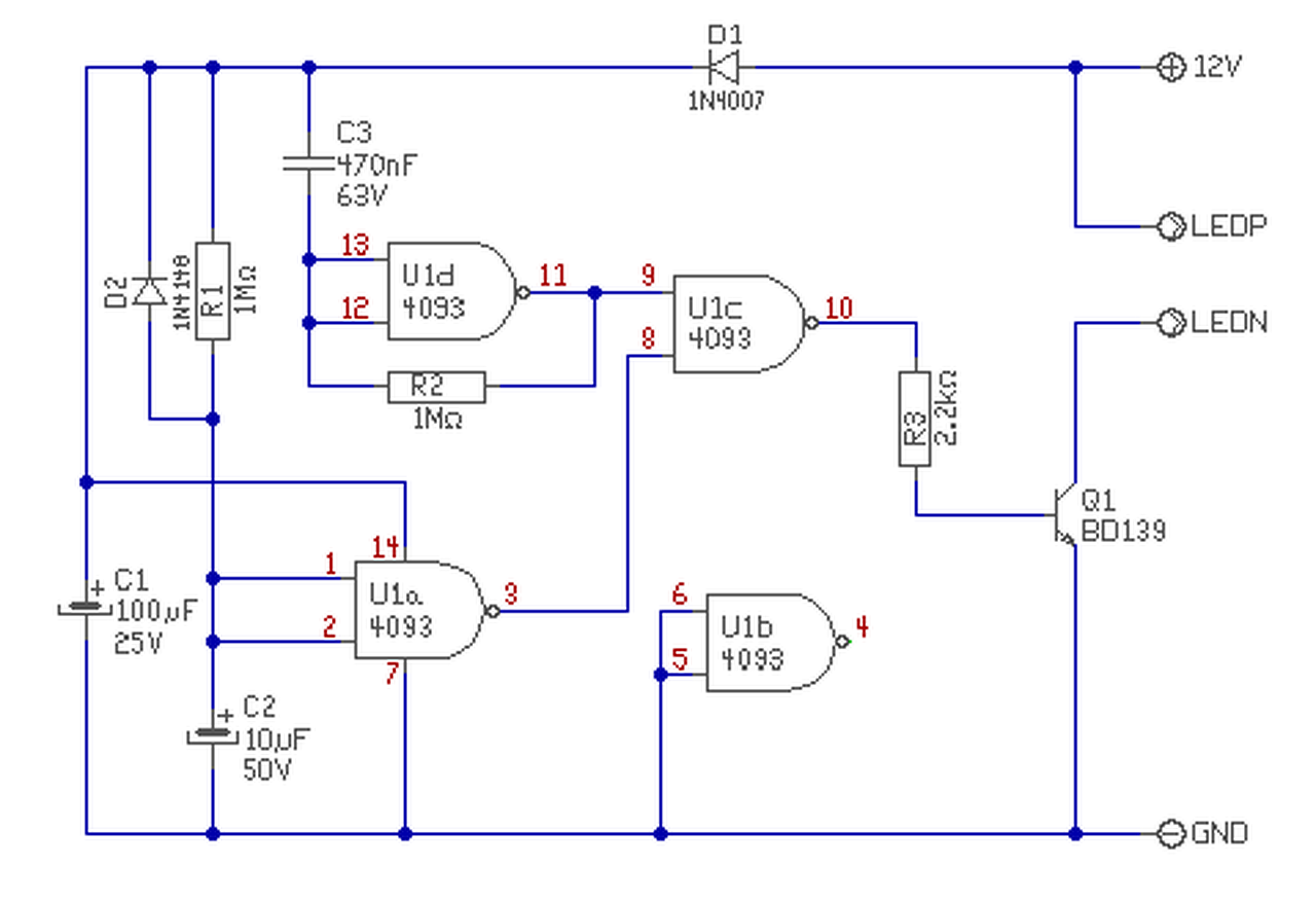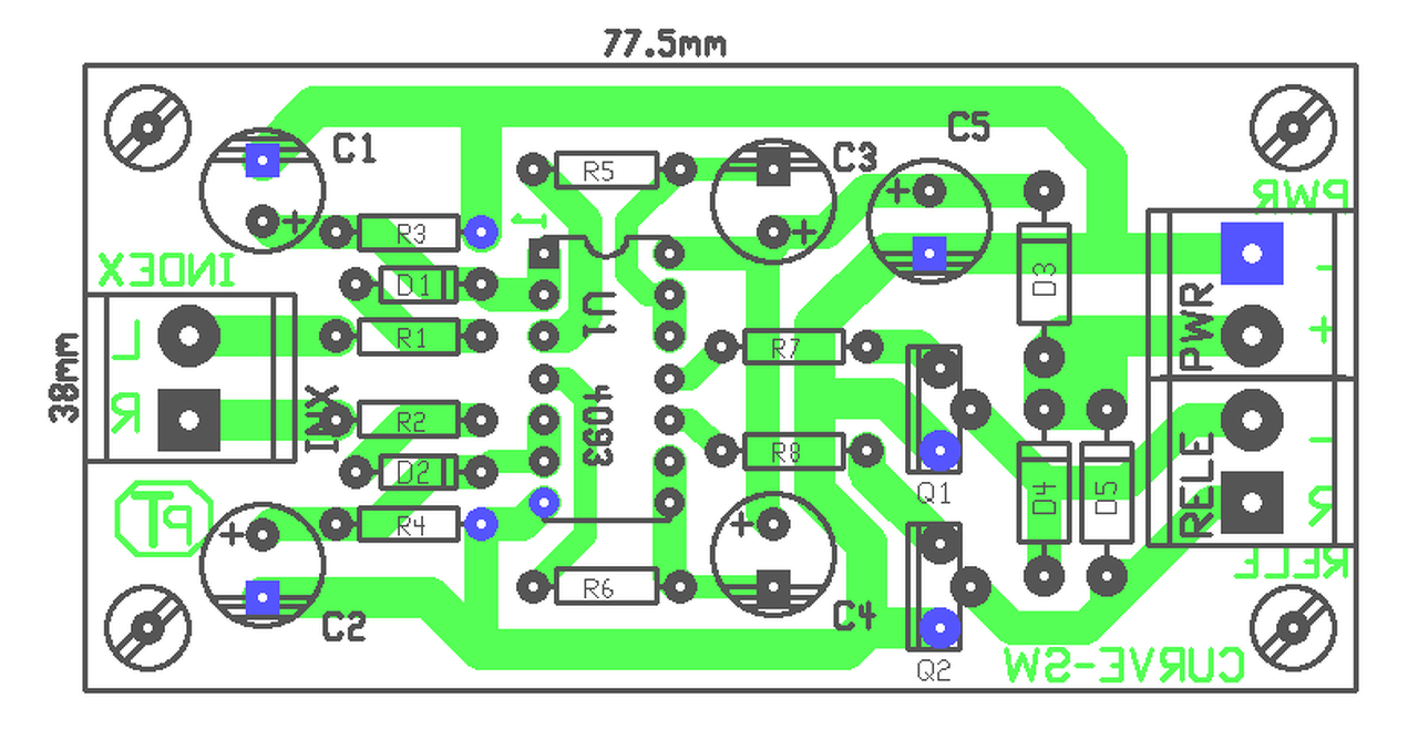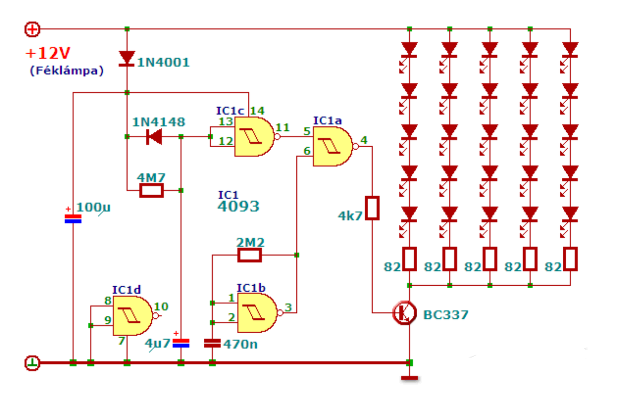 Hello! Áramkört mindig felülnézetből tervezünk. Az IC 1-es lába meg van jelölve, Te a tükörképér tervezted volna. Én az ütemadót némi módosítással megrajzoltam, A Led-eket majd hozzárakod, ahogy szeretnéd. De célszerű nem egy kis tranyót bele tenni, mert nem tudom mekkora lesz a Led-ek árama. Előtét ellenállást ki kell a Led-ekhez számolni.