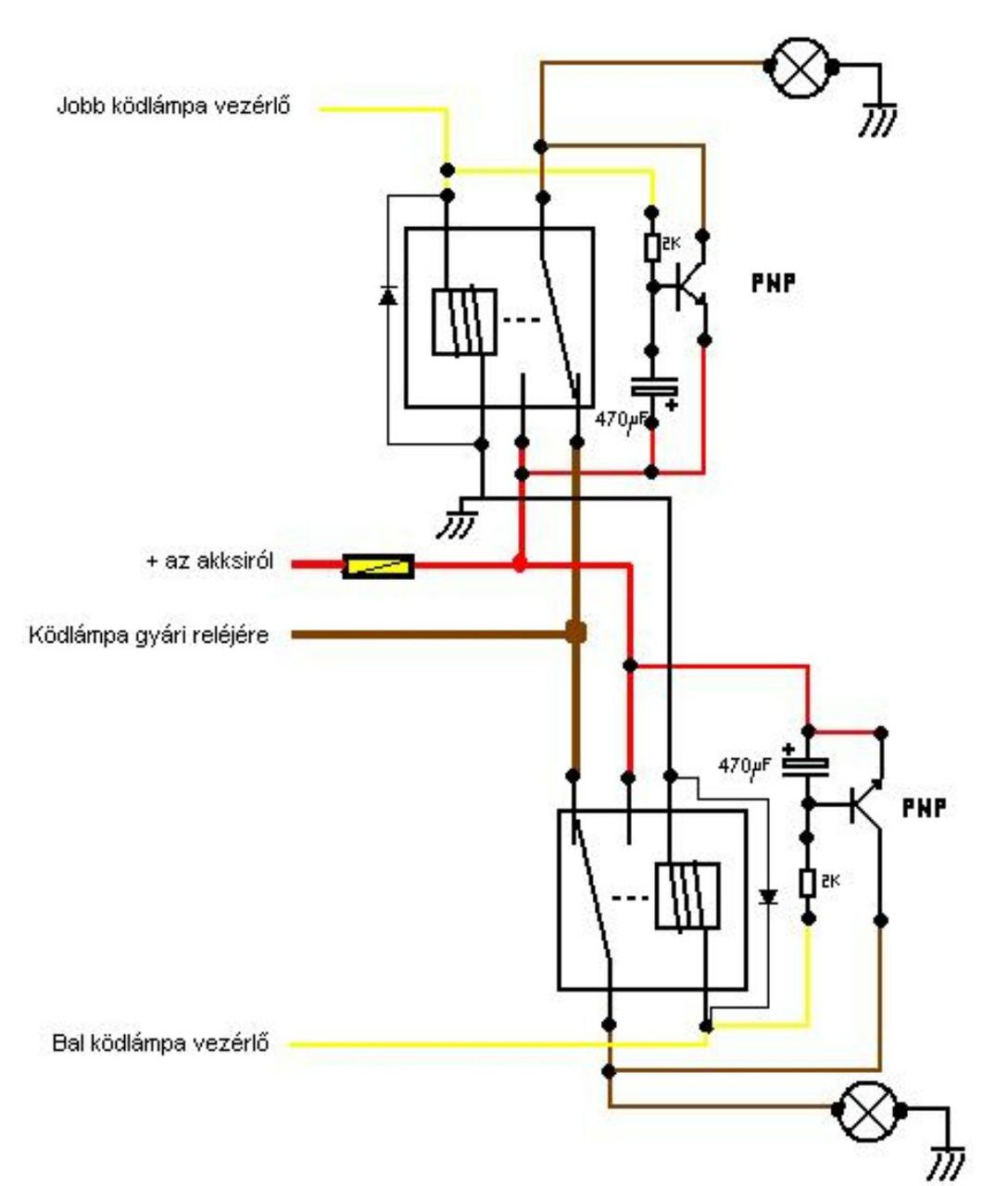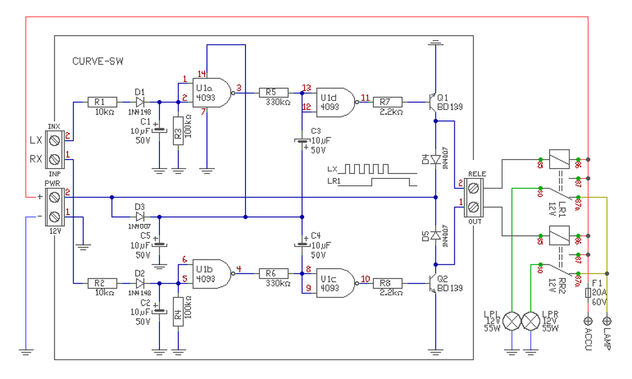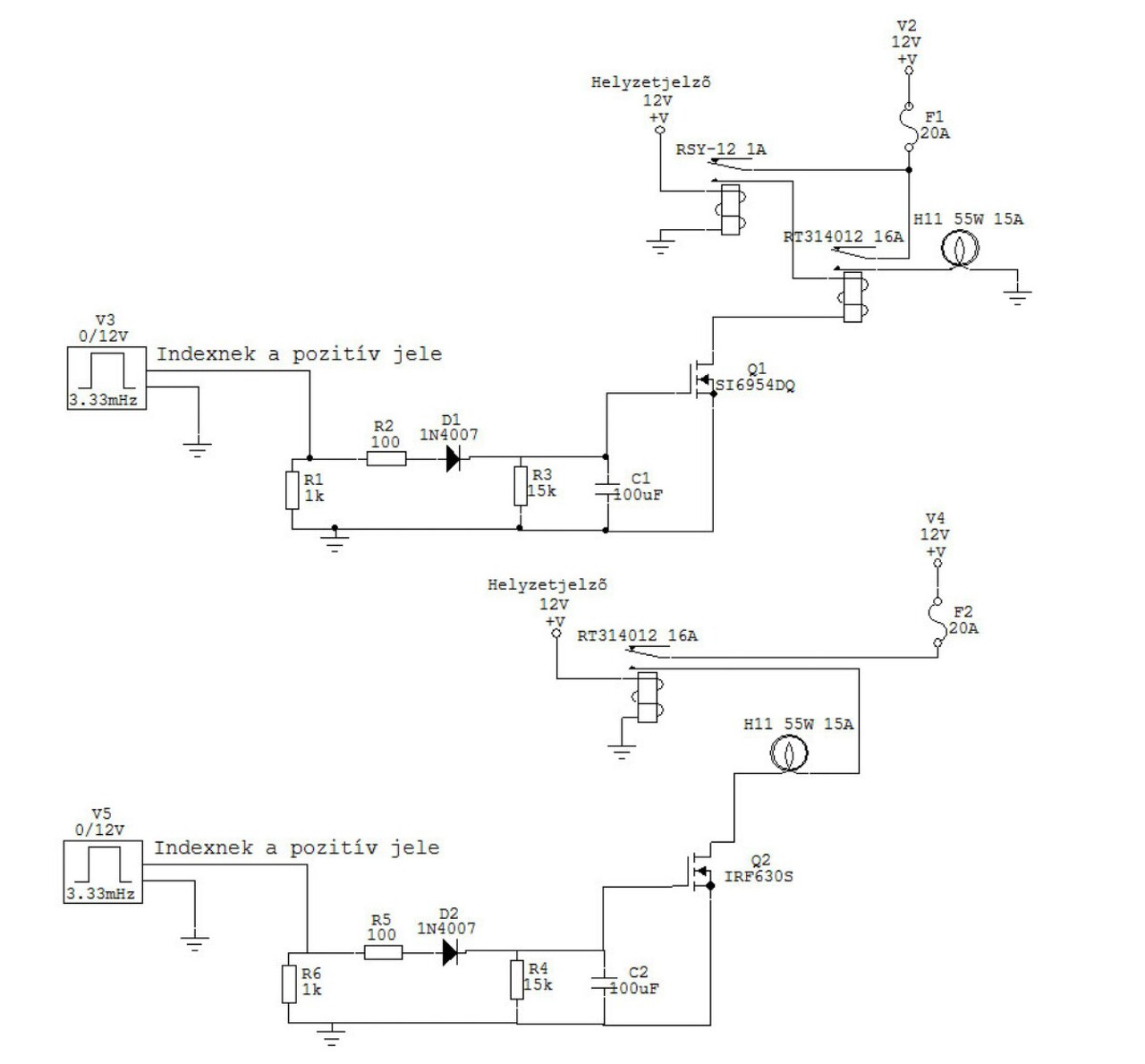 Helló! Szeretnék segítséget kérni a ködlámpa kanyarkövetö funkcióval megépítéséhez! Röviden a működéséröl, azt szeretném elérni, hogy a 3. Index jelre kapcsoljonbe a ködlámpa az adott oldalon, majd a jel végén még kb. 4mp világítson utána kikapcsoljon. Találtam erről cikket itt de régiek és valószínű, hogy ott már senki se foglalkozik a témával. Több rajzot is találtam és mellékelem is. Szerinten egy 555 időzítővel meg lehetne oldani a kapcsolás meg egy relével. Az is jó lenne ha elhalványodna kikapcsláskor ezt gondolm egy kondenzátorral lehetne szabályozni. Előre is köszönöm!