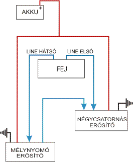 Valahogy így fest. A fej kábelezése a gyári, ezért annak nem jelöltem az áramellátását. A kék csíkok mindenhol az erenként árnyékolt rca-kábelt jelölik.