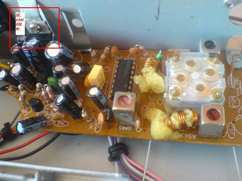 De találtam bene tranzisztort is ami a házhoz van rögzitve gondolom hűtés céljából. És alul a nyákon találtam egy égést. Majd most azt megprobálom valahogy összekötni azt kiderül! Hehe