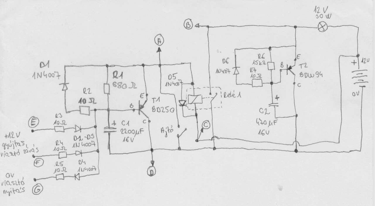 A G pontra Te +12V-ot kapcsoltál, de a dióda katódjára kapcsoltál, ami ugyebár nem működik így. Előtte azt írtad, hogy GND-t kapcsoltál rá, akkor most mit is? H pontot nem látok a rajzon, ez hol van? A riasztó kapcsolja a kp. záradat? A kp. zárnál van impulzus szerű pozitív és GND kimenet is, mivel a motorok ugye nem mehetnek a végtelenségig! Onnan kellene húzni a jelet a világításnak. Egyszerűen amúgy azt kellene, hogy megkeresed a kp. zár kimenetét amelyik nyitáskor GND-t ad és azt kötöd az A pontra. Akkor működni fog.