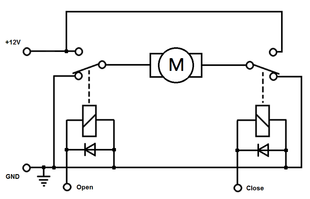 Nem láttam még ilyet, a bekötését nem találtam, de én azt mondanám, hogy a test jelre test, a + jelre +12V, a 2-3 a nyitó/záró és a motorok mennek az m1, m2 pontra. Multiméter szakadásvizsgálóval ki lehet mérni. Alapból nagy valószínűséggel a test van zárva az m1, m2 pontokkal, ha nem, akkor a + van ugyanide.