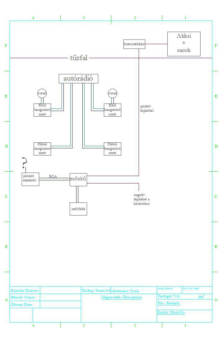 Gondolkoztam a Blaupunkt ládán is, de később kombi autót szeretnék, ezért döntöttem a külön erősítő és mélyláda koncepció mellett. Csináltam egy gyors skiccet a kapcsolásról.