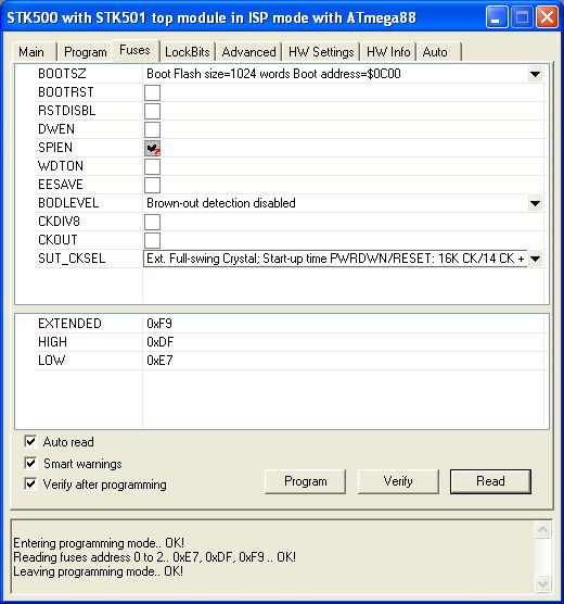 A mellékletekben csatolom a mega8 és a mega88 fuse bitjeit is, amivel nálam tökéletesen működnek a programozók.