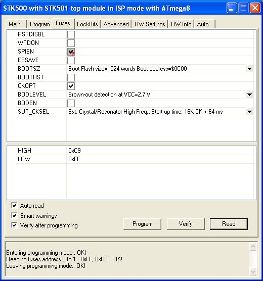 Megépítettem a Topi-féle Doper-t, az elsőt sikerült felprogiznom párhuzamos porton keresztül. Most született még 2 Doper, ezeket már a meglévővel szeretném felprogizni, ami sikerül is, de mégsem megy egyik sem. Gondolom megint azokkal a fuse bitekkel lehet a gond. Tehát az lenne a kérdésem, hogy kell beállítani az AVR Studióban ezeket a biteket??