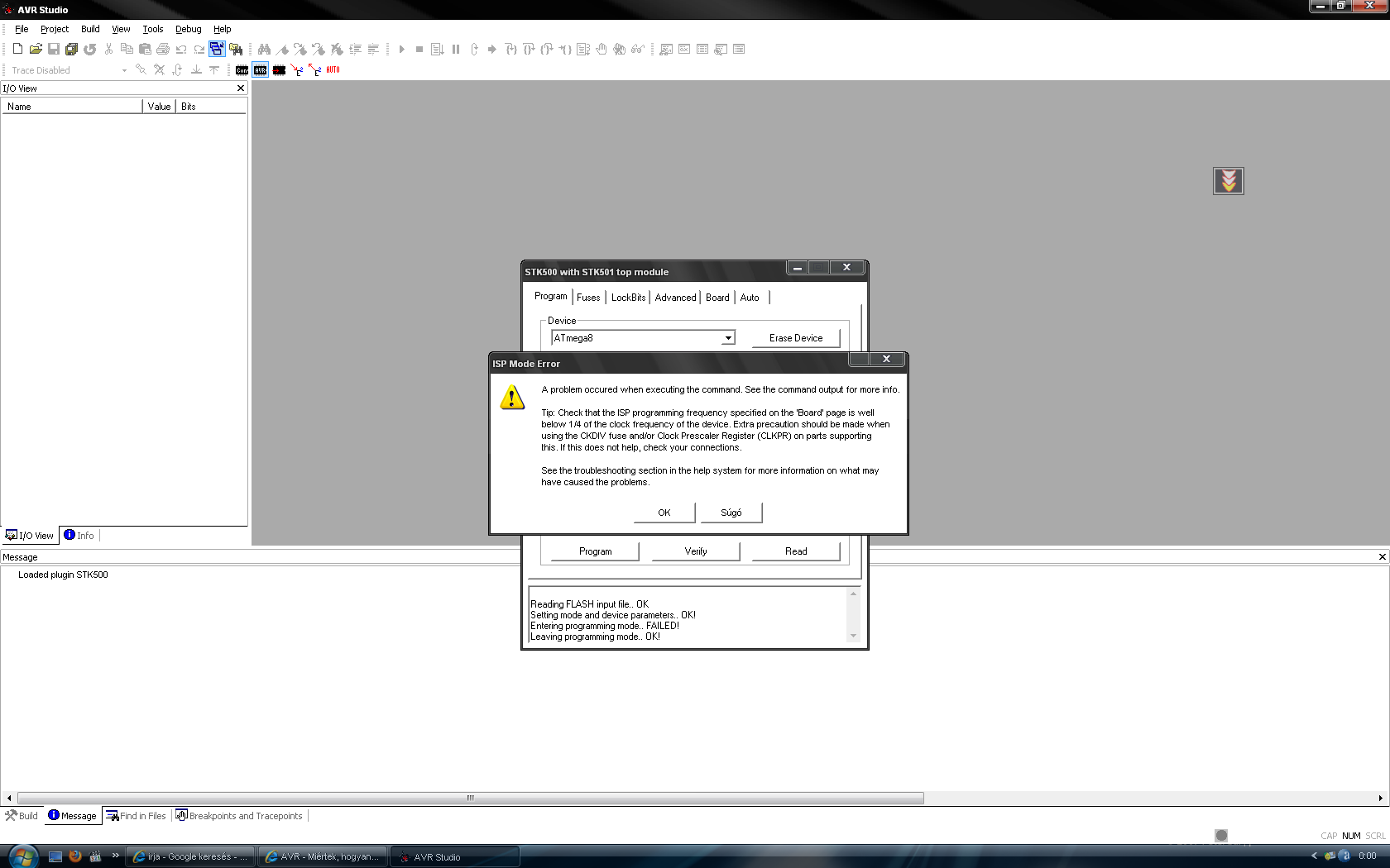 Szisztok tudnátok segíteni ,szeretnék felprogramozni egy atmega8-at de álandóan hibát dob ki pedig az ISP frekit is visszább vettem de semmi mi lehet? Köszönöm