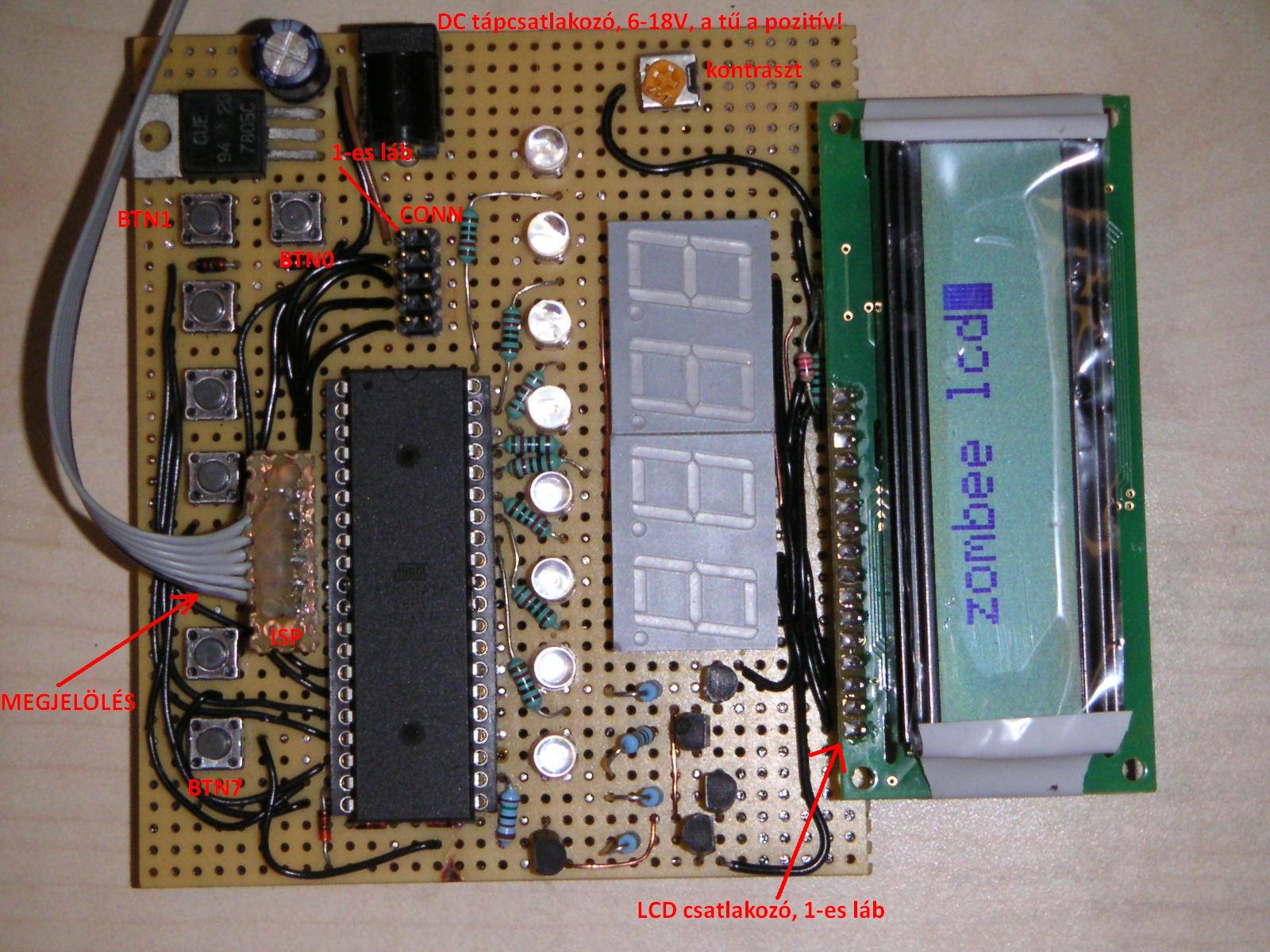 Sorosportra RS232 illetve USB-s átalakító (esetleg RS485). Ami buszrendszer kellhet: I2C (óra, hőmérő, EEPROM) Analóg jelek: potméter/elektret mikrofon/fotoellenállás Programozó kivezetés (lehet az LCD lábakon): ISP. Ehhez STK200 (LPT) vagy STK500 (USB/RS232) Ha egyetem/debuglehetőség: M16 +JTAG Csipogo! (OCxx lábra) LED 1 db, szintén OCyy lábon. INTx lábra infravevő kocka (TSOP) ill nyomógomb Resetgomb 1Wire busz (DS1820 illetve egyeb 1Wchip) Ezzel a felállással a fejlesztési feladatok 90 %-a lefedhető.... Programnyelvből: C, ASM, Bascom, Arduino Bascomot itt találsz:Bascom leírás Arduino alapok: Arduino Tippek, rajzok: Tipptár Kész fejlesztőrendszerek: Fejlesztő demopanelek