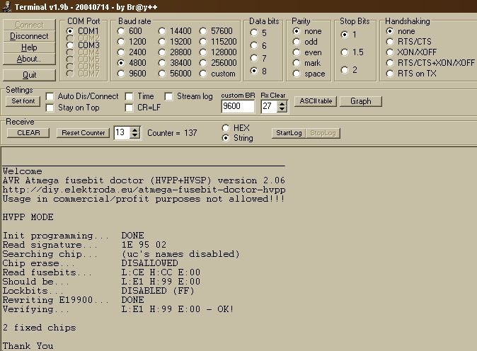 Na mindegy előbb-utóbb ki fog derüni mi van. Örülök, hogy nem ment tönkre a chipem és hogy most már meg tudom javítani ha megint gond lesz. Ezt a Fuse doctort ajánlom mindenkinek! Az RS232 kimenet külön jópofaság. Egy ellenállással meg egy tranzisztorral simán rákötöttem a PC soroportra, nem kellett maxim IC-vel sem szőrözni. (De PC nélkül is megjavítja, de akkor csak a ledekről látod hogy mi a helyzet)