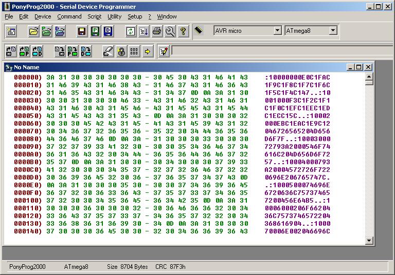 AVR-el még nem dolgoztam, csak PICcel, most is csak beégetni szeretnék egy kész programot. (mellékelem). Ez a hex file teljesen úgy néz ki,mint egy PIC-es hex file, a sorok elején a memória címek is láthatóak (mármint a tartomány, soronként). Készítette egy soros égetőt a lancOS oldal alapján,és PonyProg-ot töltöttem le az égetéshez. A kontrollert írom-olvasom, teljesen jól működik, egy bajom van: Ha betöltöm a HEX filet,akkor a program kódban megjelenik a hexfile sor elején lévő memóriacím is, így a 8K-ba beleférő kód, túllép jóval 8K-n, az eeprom területre is beleír, tiszta zöldség az egész.... Szóval a kérdésem az lenne, hogy hogyan tudom a programozó szoftver értésére adni,hogy ez a hexa file ez tartalmazza a címet is a sor elején,és azt ezért ne tegye bele a kódba?! Köszönöm a segítséget előre is!