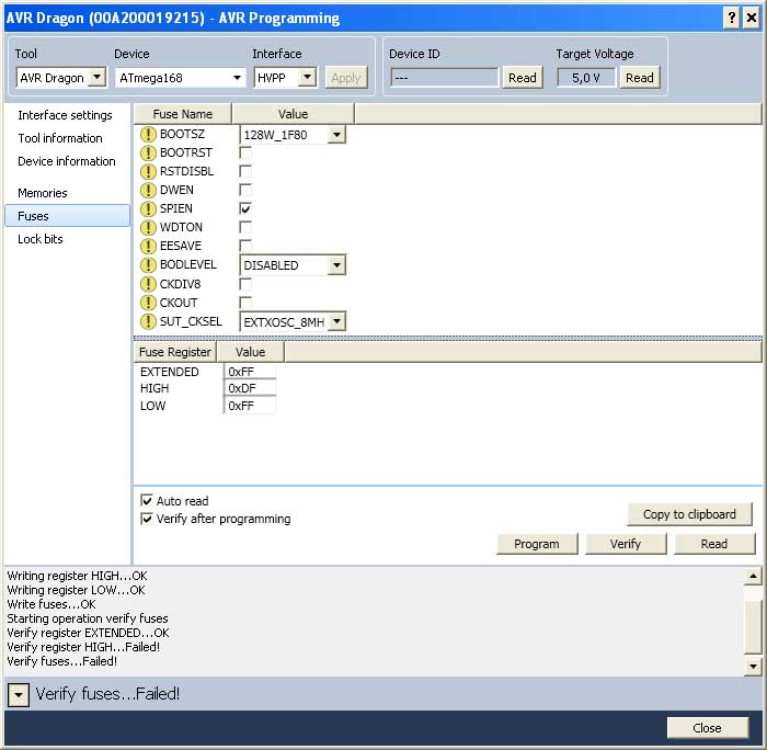 Egy "Erase Device" - t próbálj még ki rajta. Utána állíthatod a FUSE biteket. A neten azt találtam hogy egyedül HVPP-n és debugWire-n tudod kikapcsolni a DWEN-t. ITT írnak róla egy oldalt(debugWire), de tutira ki lehet HVPP-n is kapcsolni!