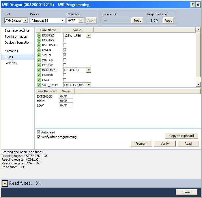 Egyébként a Dragon képes debugWire-re is, de a HVPP-t azért ajánlottam mert ez a ritkábbik eset, gyakoribb az órajelforrás elállítása. Egyébként szép munka(mármint a bekötögetés), mintha csak én csináltam volna. Gratulálok!
