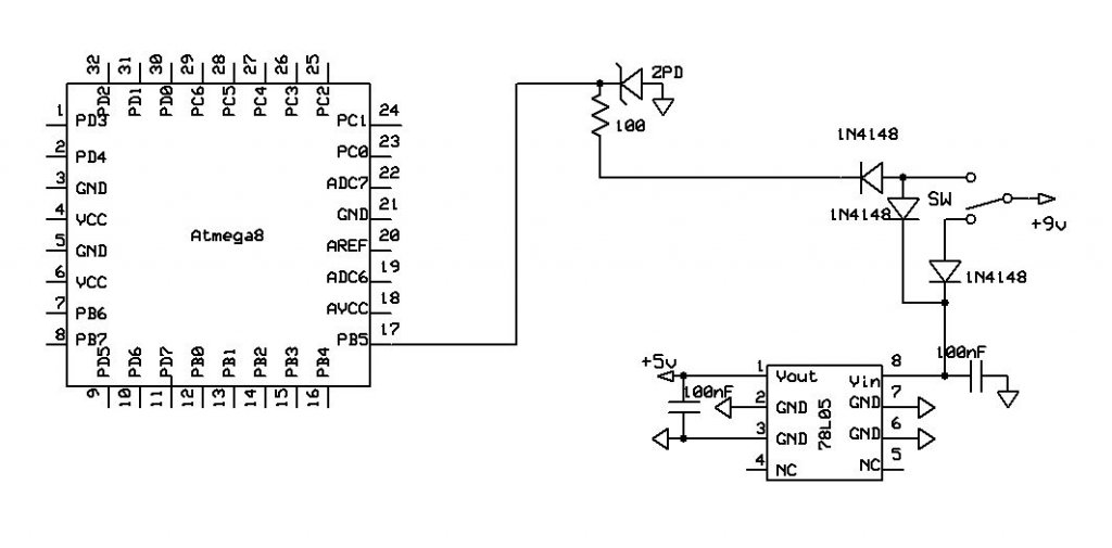 Felső pozícióban 9V megy a zéner felé, ami ~5V-ot eredményez az AVR PB5 lábára. Alsó pozíciójában viszont ha jól látom kvázi csak lebeg a PB5 bemenet, mindenesetre versenyeznek a diódák, hogy melyiknek győz a szivárgási árama, ami szerintem bizonytalan feszültség állapotot eredményez majd a PB5 bemeneten. Szóval ez szerintem nem nyerő így. Vagy legalábbis nem értem. Egyébként írd le konkrétan mit szeretnél, hátha tudunk tanácsot adni hozzá egy harmadik módszerrel, ami ugyanarra az eredményre vezet.