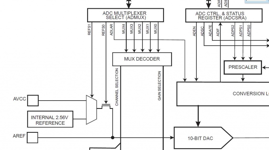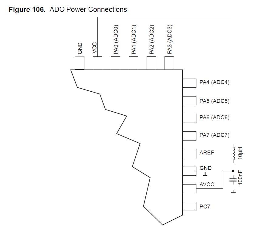 Idézet: „Nálam AREF=AVCC= RC szűréssel +UT.” Szerintem az AREF láb és a test közé 100nF kondenzátor kell, ha az UREF=AVCC, vagy, ha az UREF=Internal reference (2,56V). Ha külső referencia feszültséget akarsz használni , akkor azt kell oda kötni. Az AREF és az AVCC ellenállással való összekötése eltolhatja a referencia feszültségét az ADC-nek. Kérdés : miért kötöd össze az AVCC és az AREF lábat ? A mellékelt első kép nagyon beszédes, ha REFS0 értéke 0, akkor külső referencia feszültségről megy az ADC. Ha a REFS0 értéke 1 akkor, vagy AVCC a referencia, vagy a belső 2,56 V (a REFS0-hoz tartozó FET vezet), ekkor REFS1 értéke dönti el melyik, ekkor nem célszerű az AREF lábat külső potenciálra kötni. A második képen az AVCC szűrése látható. A hozzászólás módosítva: Jan 7, 2013