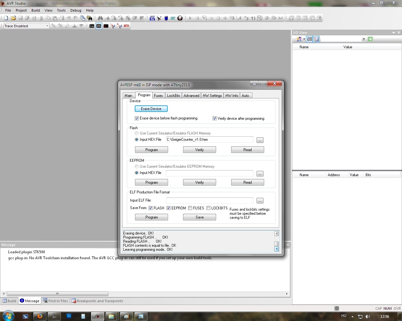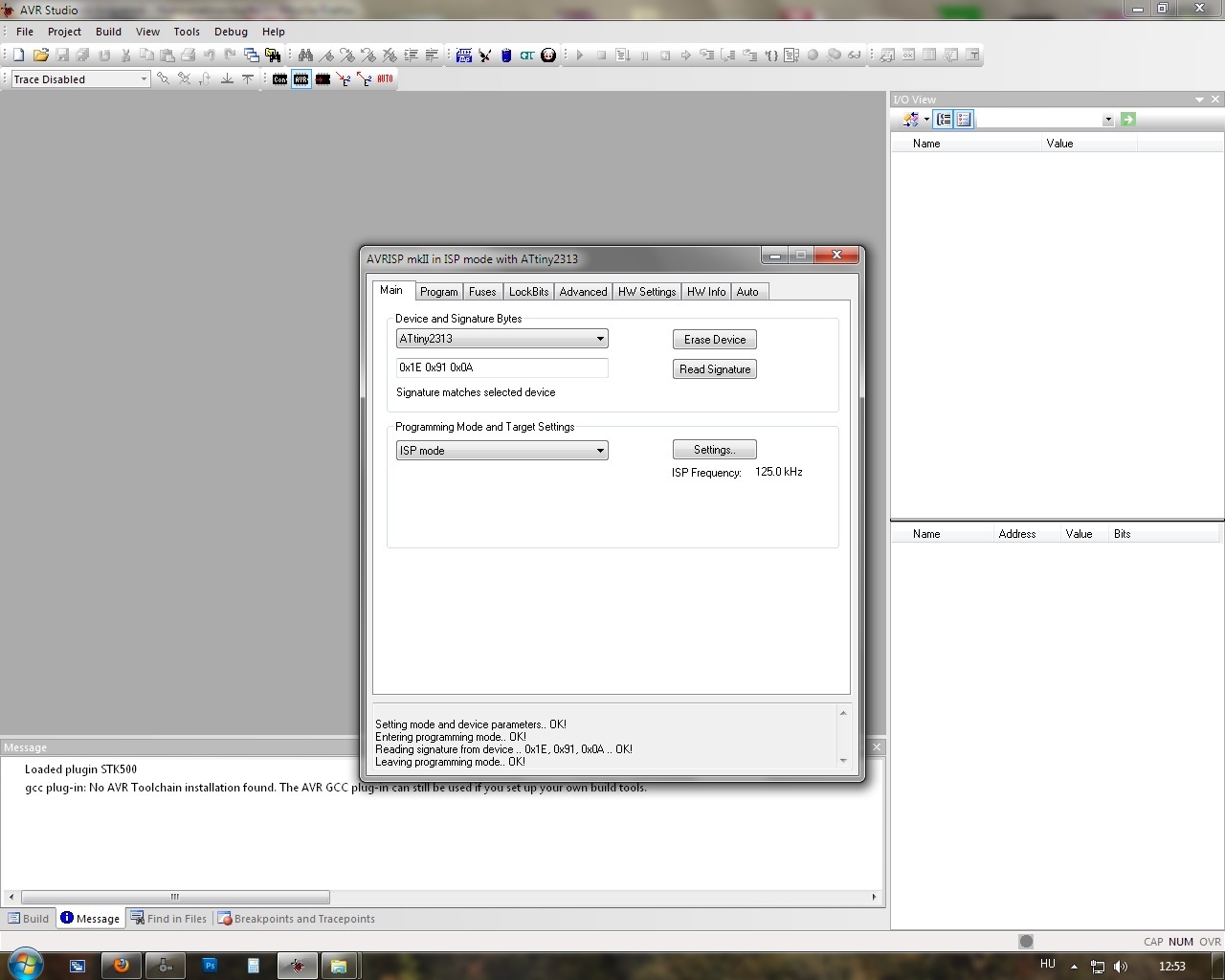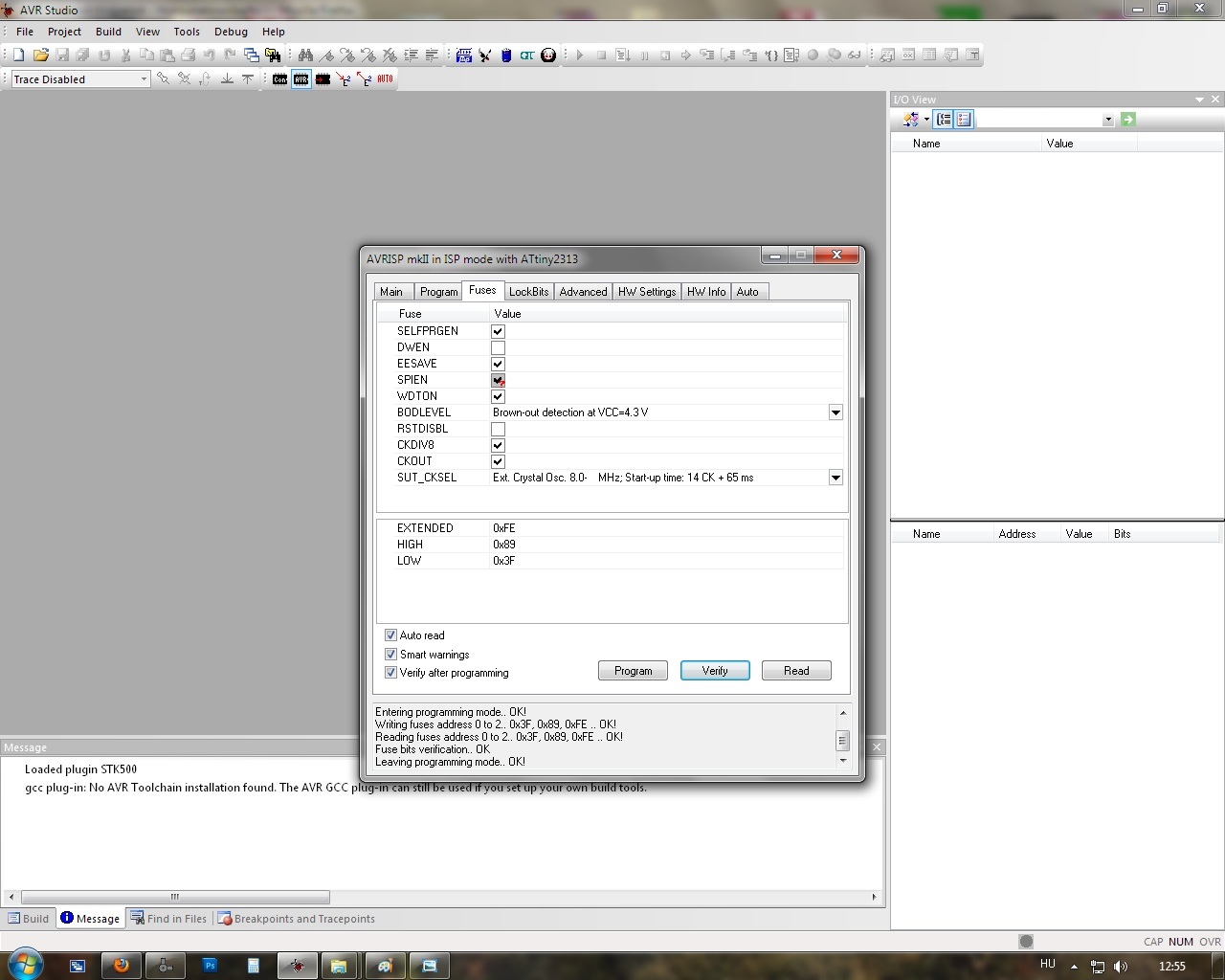 Szeretnék egy kis segítséget kérni. Egy Tav-IR MKII-vel szeretnék egy Attiny2313-ast felprogramozni,de sehogy sem sikerül. Avr Studio 4.19-el próbálkozok,de bárhogy állítom a fuse biteket (kivéve azokat amikre a program figyelmezett) mindenre OK-ét ír. A felprogramozásnál sem ír ki hibát,de mégsem működik,a 2x16-os lcd felső sorába csak kockák jelenek meg.Egyszer sikerült elérnem,hogy egy pillanatra megjelent a kijelzőn aminek kellet,de utána csak vibrált. Abban szeretném a segítségeteket kérni,hogy hogyan állítsam be a programot. Mellékelek pár print screen-t arról amit csináltam,és a fuse bits táblázatot ami a hex-fájlhoz járt. Az Attiny 5 voltról,és 20Mhz quartz-ról megy. A segítséget előre is köszönöm.
