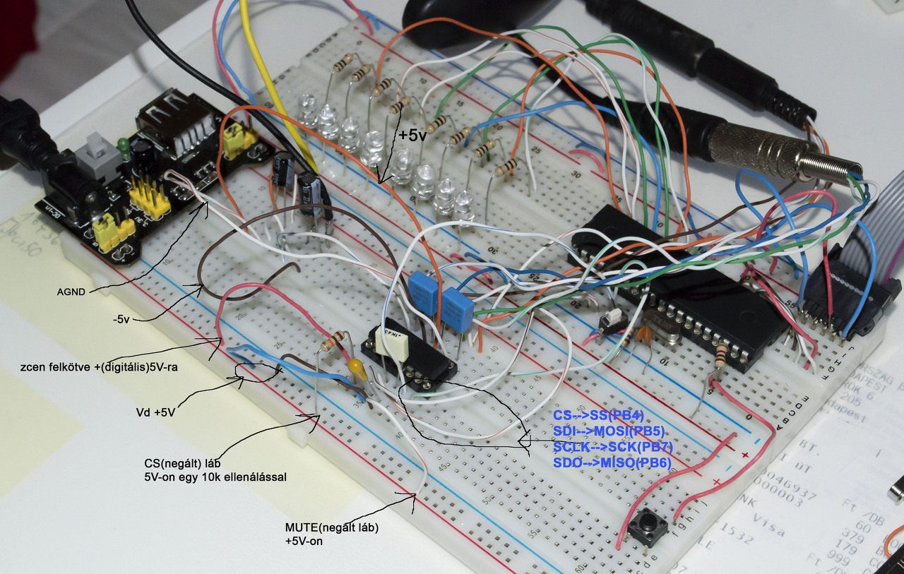 Hat.. nem eppen egy telifoldes nyák.. Ha az SPI kommunikaciora gyanakszol, akkor azt megteheted, hogy megnezed, hogy mi jon vissza a szabalyzo chip-bol. Mondjuk kikuldesz neki 4 byte-ot (pl: 0x55aaffff) es megnezed, hogy mi jott vissza. Elvileg 0xxxxx55aa kell visszajojjon belole. Az elso negy x az elozoleg beletoltott hangero ertek kell legyen. Mekkora SPI orajelet hasznalsz?