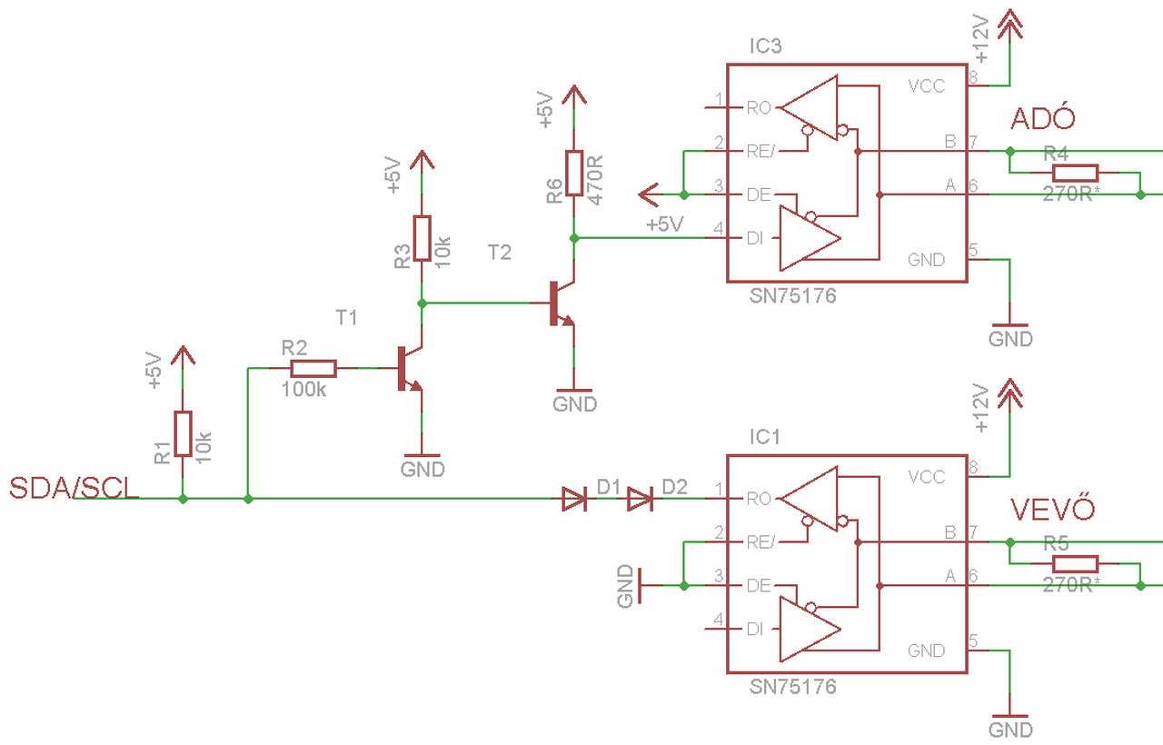 És ha azt csinálom, hogy csak az rs485-nél alkalmazott kábelezéssel és SN75176 IC-kkel, két érpárral, 12V-tal "felerősítem" az I2C-t? A csatolt képen látszik, hogy mire gondolok.