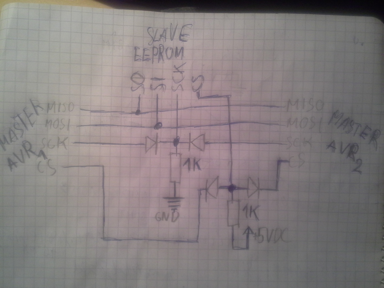 A 8 bites AVR-ek világában milyen lehetőségeim vannak olyan kommunikációra, ami képes kb. 500Kbit/s sebességű kommunikációra és a buszra felfűzhetek két AVR-t és egy EEPROM-ot? Az egyik AVR időnként felülírna az EEPROM-ban korábbi értékeket, a másik AVR pedig teljes erejével folyamatosan olvasná az EEPROM-ot (és rajzolná egy grafikus LCD-re a benne található adatokat bitről-bitre). Az SPI-t esetleg meg lehet valahogy variálni, hogy a két Master ne vesszen össze, hogy éppen ki használja az EEPROM-ot? Én ezt gondoltam ki. A diódákat ugye jó irányba rajzoltam? A hozzászólás módosítva: Dec 30, 2015