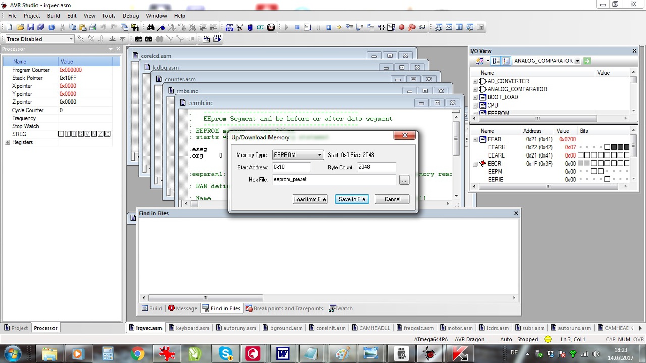 Valami rossz gombot nyomtam meg és azota nem kéri a debug elött, hogy betöltse-e az EEPROM tartalmat. ( eddig itt voltak az indulási adatok amik nagyon kellenek a debughoz). Most meg a maximumot rakja mind a 8 regiszterbe igy évekig léptethetem a programot ha a végére akarok jutni. Képtelen vagyok megtalálni hogy ahogyan kell ez EEPROMba beállitani az kiindulasi értéket és azt betölteni a debuggerhez. Amigy a program megy jol kezeli az EEPROMot is, de eddig az elején mindig kijött egy ablak ahonnan be tudtam tölteni a kezdeti kis értékeket. Kösz.