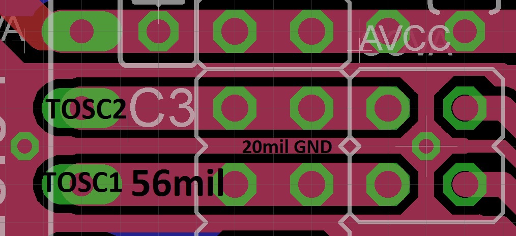 Miközben ezt írom egy apró módosítással az if(rtc_clk_pulse_cntr.l[0] >= 0x1000)-ben -> if(rtc_clk_pulse_cntr.l[0] >= 0x0200)-re már észleli, hogy baj van és külső RTC-ből kiolvassa az aktuális időt. Szóval nem software gondom van hanem hardware. Jelenleg egy 6 vagy 9pF-os kristály (bocsánat nem emlékszem melyiket raktam annó bele) van a lábakhoz közel, kondik nélkül, igaz nincs forrasztva ("prototípus PCB"). A mellékelt képen a PCB kialakítása látható. Hogyan kell a kristályt holtbiztosan rákötni? A hozzászólás módosítva: Nov 6, 2021