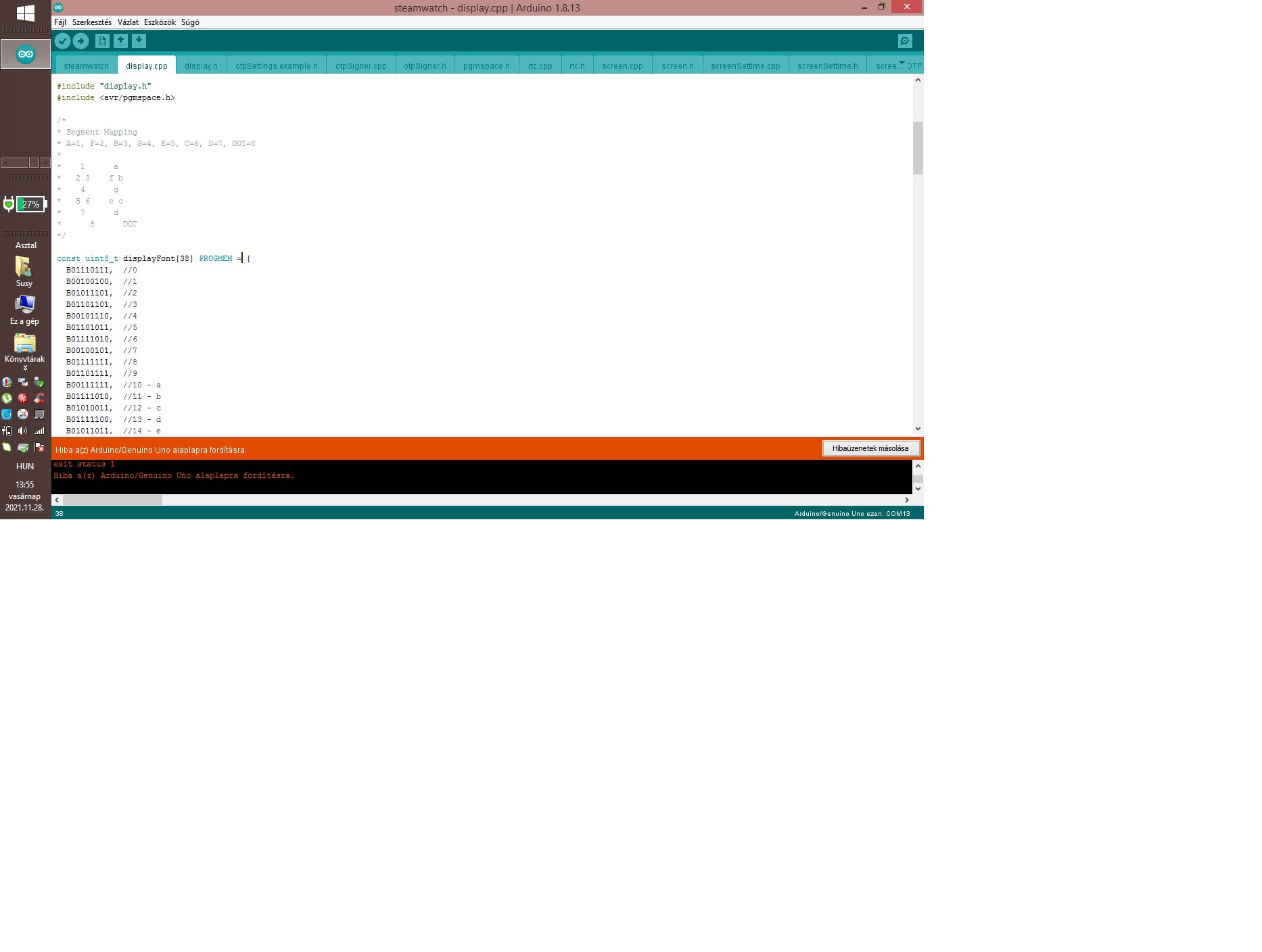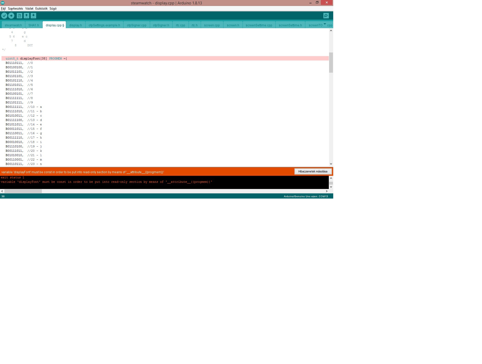 Utánépítenék egy projektet.Bővebben: https://youtu.be/x1jnJJqWmE8 Az a probléma ,hogy az arduino idében a program neltöltéskot nem fordul le .A használt avr ic atmega 328p. Következő a hibaüzenet: Display.cpp fájl (PROGRAM prog_uint8_t displayFont [38] segítségeteket kérném. a filok: https://github.com/johannes85/numitron-watch A hozzászólás módosítva: Nov 27, 2021