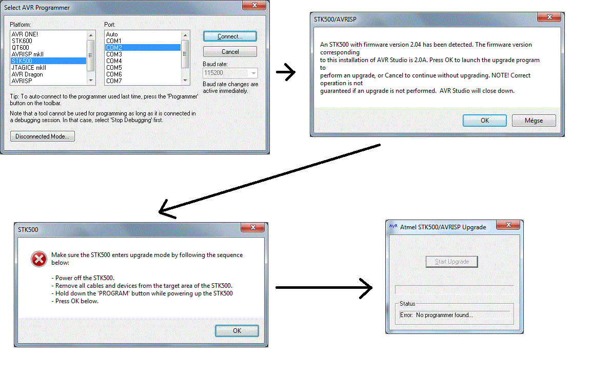 Topi leírta a cikkében lévő videónál jelzi, hogy annál az ablaknál ahol azt írja ki, hogy "An STK500 with firmware version 2.14 has been detected..... a Mégse gombra kell kattintani!! A belső firmware-t nem tudja frissíteni az AVR Studio-ból!