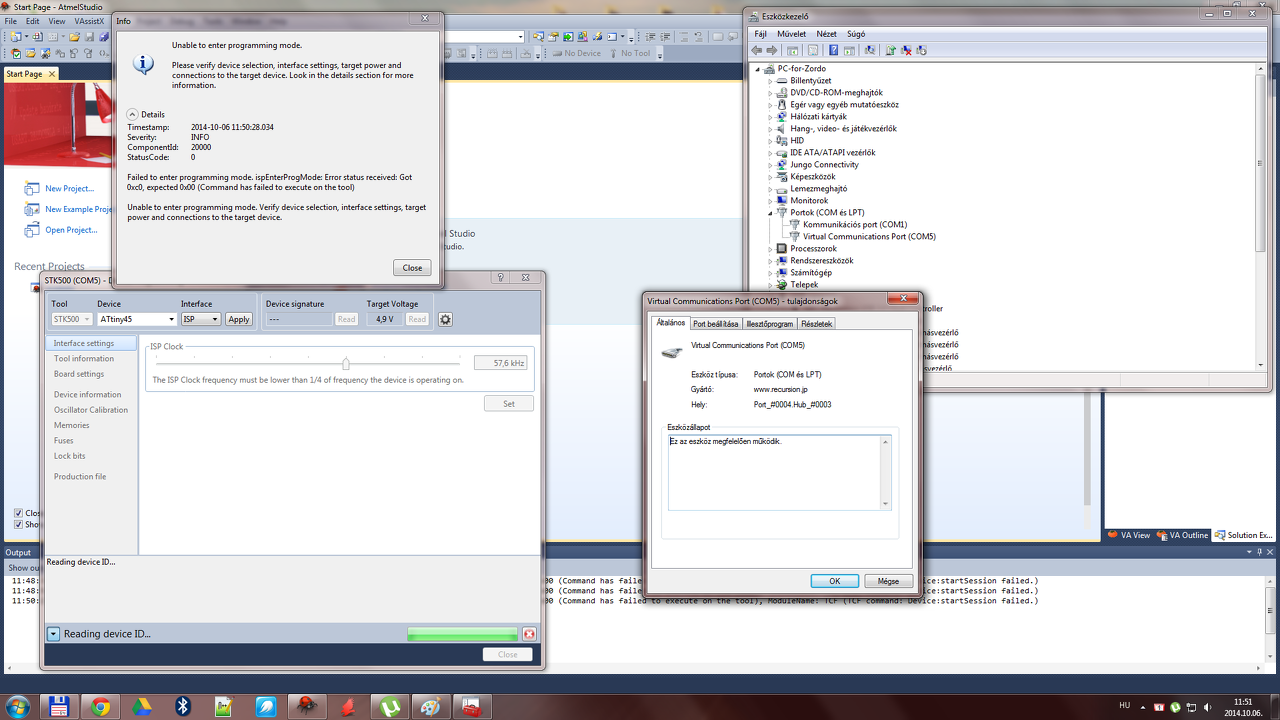 Átolvastam a fórumot, megcsináltam Petjaa #812246 hozzászólásában leírtakat, és azóta tudok csatlakozni a programozóra, megy a virtuális COM port. De! Mikor a programozás részhez érek, már a "Device signature" -> "Read"-nál az alábbi képen látható hibát dobja. Az eszközkezelőben is látszik, hogy minden "OK", de akkor mi lehet a probléma? Előre is köszönöm! A hozzászólás módosítva: Okt 6, 2014