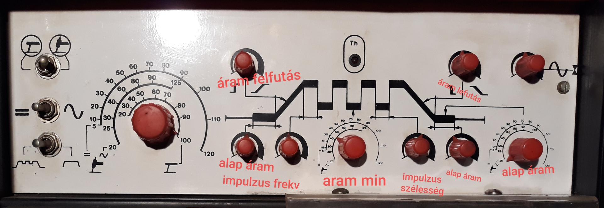 Kezdjük a felső potikkal: bal szélső:áram felfutási idő; középső: áram lefutási idő;jobb szélső: balansz, AC üzemmódnál a pozitív és negatív félhullám arányát lehet vele állítani. Alsó sor poti: Bal szélső főáram;második: előmelegítés időtartama;harmadik:főáram időtartama impulzus hegesztésnél;negyedik:alapáram nagysága;ötödik alapáram időtartama impulzushegesztésnél;hatodik a kráterfeltöltési idő;hetedik pedig a kráterfeltöltő áram. A fel -és lefutásnak csak normál üzemmódban van funkciója,impulzusüzemben nincs szerepe, bár találkoztam olyan géppel amelyiken mindig működött. A balansz-ha túl nagy értékre van állítva bármelyik irányba, erőteljesen elmágnesezi a trafót emiatt elég nagy áramot vesz fel a gép a hálózatból.