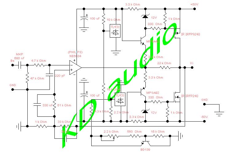 Hány V -ra van tervezve a kapcsolás? Nem üzemelteted véletlenül alacsonyabb tápfeszről az erősítőt, mint amekkoráról kellene? Mérj már feszültségeket a FET -eken!