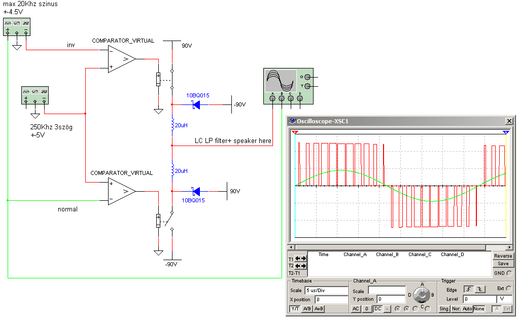 Méghozzá nagyon pontosan: http://kep.kepfeltolto.hu/171/1172261783.png -0.2fok a bemenő jel és a visszacsatolt jel közt a különbség. Ebböl a PDFböl vettem ki: www.onlany23.atw.hu/class-d_sch.pdf Az a baj hogy csak virtuális OPA-al müködik. Ha nem 0 a Compensation Capacitance (CC) akkor kicsit sem lesz szinkron. De viszont a PDF tulaja megcsinálta TL082-el és neki müködött.