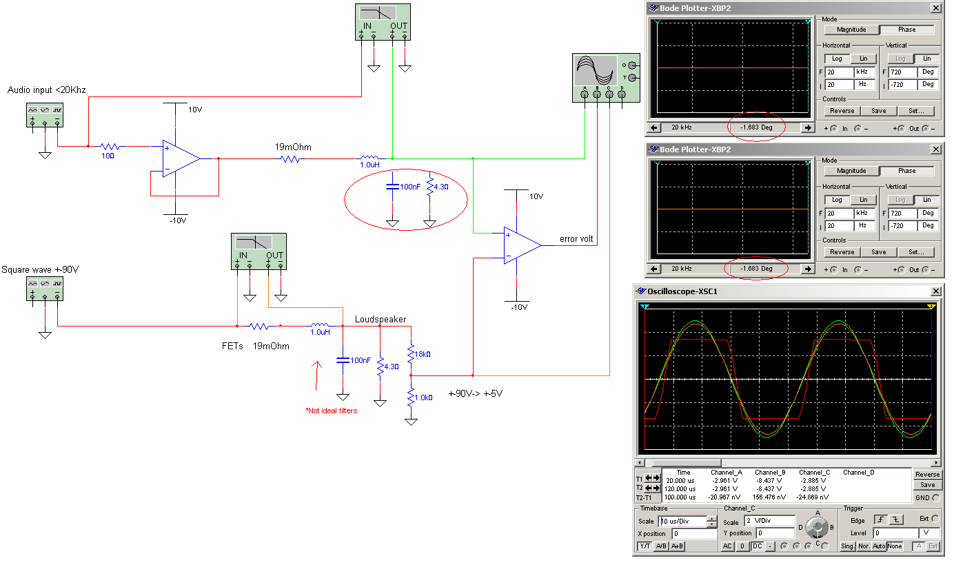 megy.Moduláció elött sok minden okozhat pl DC offsetet, és ha egyen feszültség kerül a hangszororra akkor annak annyi. H-hidban kivonodnának egymásból a DC offset hibák, de ugyanakkor sokkal többe kerülne (2szer annyi Fet, Gate drive,szürő). Másrészt minden PWM-erősítőnek kell visszacsatolás, mert sokkal kisebb THD-t lehet elérni vele, Van egypár modulácios hiba forrás van pl FET-ek inlinearitása. A legjobb lenne ha az LC szürő utánról lehetne visszacsatolni mert akkor a szürő hibáit is kompenzálná, nem is beszélve arrol hogy a hangszoró impedanciájától függetlenítené az audio frekvencia menetét. Ennél a modulácionál sokkal kevesebbet kell szürni mint egy ClassD-nél, itt kell 2db LC tag egy 250Khz-es és egy 500Khz-es low pass. vagyis egy 1uH-es és egy 2uH-es induktor. nagyon kevés lesz a feszültség fázis eltolodása a bemenethez képest. Olyan delta 7fok. Talán lehetne ezt kompenzálni és ugy már visszalehetne csatolni a bemenetre, és akkor még stabilabb lenne.