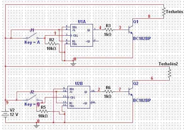 Ez egy J-K flip flop-os nyomógombos "kapcsoló"! Nem tudom milyen terhelésre kell, de a terhelés alapján válaszd meg a tranzisztorod típusát! A felhasznált IC egy CD4027BC dual J-K flip flop! Ezzel két nyomógombot tud kezelni és két terhelés tudsz vele kapcsolgatni! Felfutó élre bekapcsol és újabb felfutó élre kikapcsol ennyi a működése! Remélem tudtam segíteni valamelyest! Üdv: Dempsey!