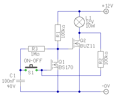 De hogy a kedvedre tegyek, rajzoltam egy 12V-osat is. Remélem elég egyszerű. Ezzel akár ampereket is kapcsolhatsz. (Lámpa az természetesen nem kell, csak szemléltettem a terhelést.) Grátiszként a Q2 nagyobb Cgs kapacitása miatt, tápfeszültség bekapcsolásakor, mindig kikapcsolt állapotban van. Természetesen más teljesítmény Fet is alkalmas bele. Kikapcsolt állapotban a fogyasztása mindössze 120uA. üdv! proli007 |