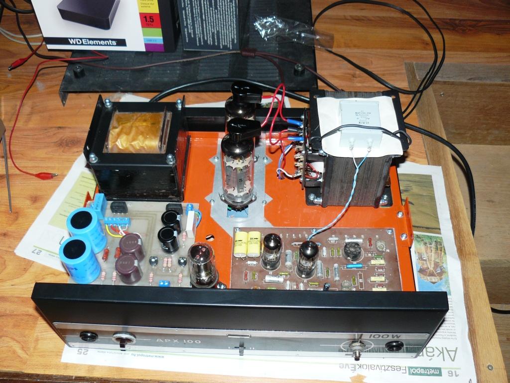 Audiofil talin ott is volt a puskásban júliusban. (a zöld Rável VR102) Sikerült egy gyönyörű szép állapotút vennem ritkaságként potom 18000 Ft ért és kicsit átalakítottam a meghajtást, és az előfesz beállítást, és máris 190W jön ki belőle szinuszban 1100V tápfeszen OS51 PushPull. Az eredeti hálózati trafó van benne és brutál 2x840V váltót ad le ezt 2 db AZ4 egyenirányítja és 2 db 12µF 550V-os orosz olajpapír kondi a puffer. Az eredeti kimenő van benne ami majd 40cm2-es vaskeresztmetszetű
