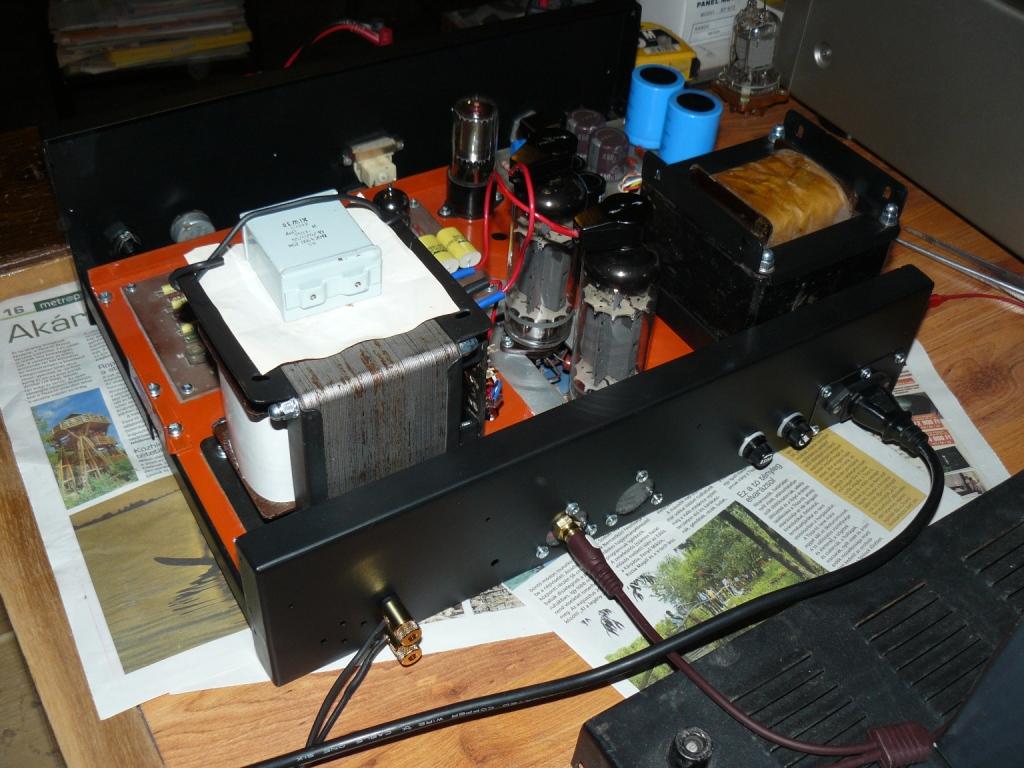 A voltmérő csak viccből van rajta, mondom, hogy fogalmam sincs mire jó (illetve most már kezdem érteni). Nem vagyok szaki, de olvastam, hogy egy esetleges nagyfrekis gerjedés, amit a kimenő át sem visz, "lefullaszthatja" az erősítőt. Erre gyanakszom. Azért kicsit érthetetlen a táp tegnapi zűrje nekem, mert esküszöm, hogy kapcsolás tekintetében ugyanúgy kötöttem be a dolgokat, csak teljesen más elrendezésbe, esetleg más pontokon (konkrétan a trafó középleágazásától most a vezeték elsőként a stabcsőhöz megy és a táppanel oda csatlakozik az 1Kohmos ellenállások elé. Most úgy néz ki a táppanel, hogy: anód bemenetnél még a váltó részen nagy kék ERO 1600V/0,1uF, a két főkondi 330µF/450V Philips, a további két kisebb 100µF/450V Samwha és az előfesznél is 2x100µF/250V Epcos van (ez utóbbi tudom, hogy lehetne akár 100V-is, de csak ez volt éppen kéznél). A szekunderre tettem egy 4,7Kohm/5W előterhelést. Az előfokpanel végén 2db 630V/400nF-os sárga ICW kondi van, míg az 5µF-os csatoló egy 350V-os 4µF-os C3012-es fémkannás REMIX meglehetősen bénán a kimenő tetejére kötözve. Ezek még ideiglenes dolgok, de most már majd lehet variálni.