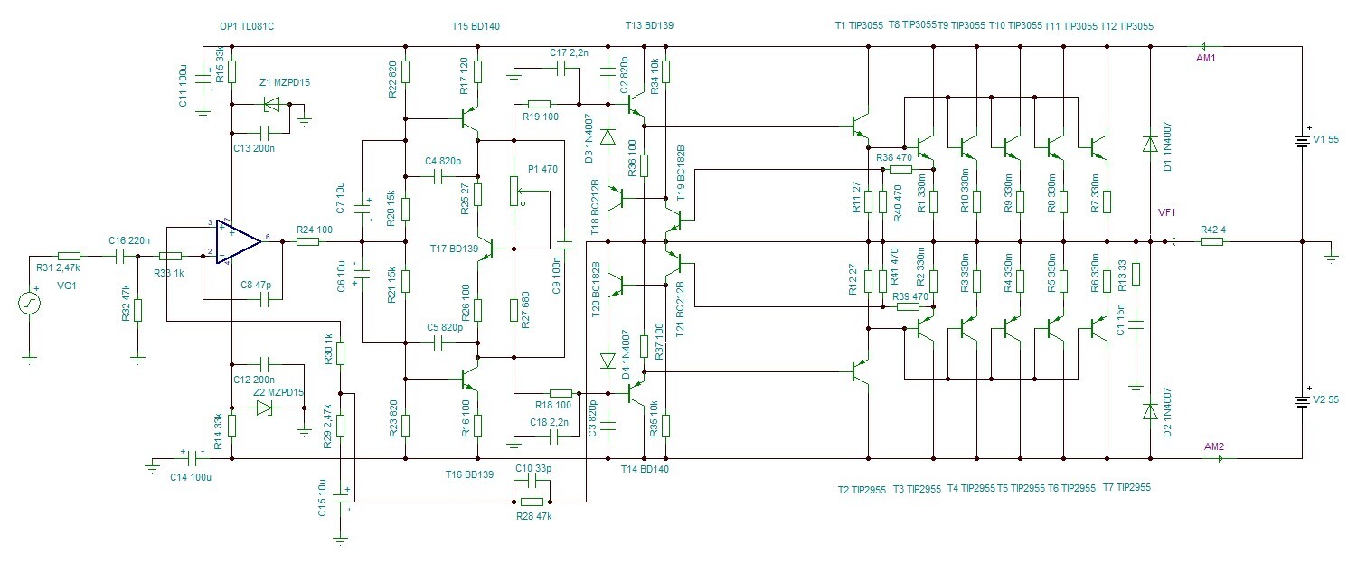 Visszarajtoltam az Audaxot, de ... R11-R12 értéke a nyákon 2,7ohm.. ez szerintem nem igazán lehet jó, a szimulátorban ez "kezelhetetlen" - túl magas az áram R11-12-n. 10X-re emelve 27ohm-on már minden ok - a szimulátorban -. Viszont elvileg ezzel a 2,7ohmmal működött.. elvileg.... De így ahhoz hogy a végtranzisztorokon valamiféle áram haladjon át, ahhoz a meghajtó tranzisztorokon közel 170mA kell. Ez így egyébként jó lehet? A kimenet egy Beag TK222 illesztőre dolgozik. Nincs ohmikus kimenete. Egyébként valaki biztosan kókányolta, mert a 12db BD több féle volt benne. Valaki megtenné, hogy belenézne? Érdekelne a véleményetek. Lehet nem jó a rajz, de pont ezért is jó ha több szem többet lát. Az ellenállások értkeit a vezérlő panelen ellenőriztem. |