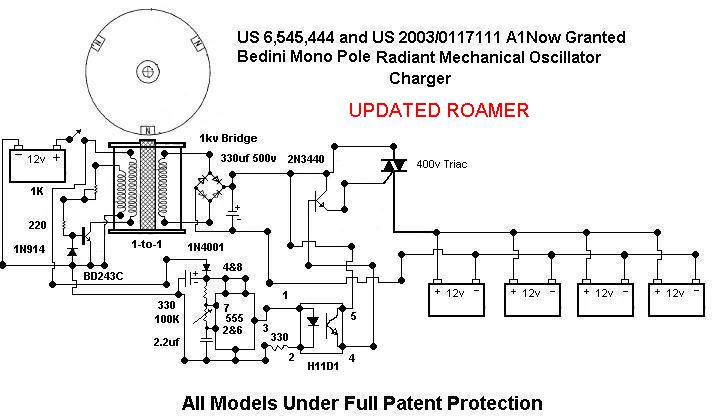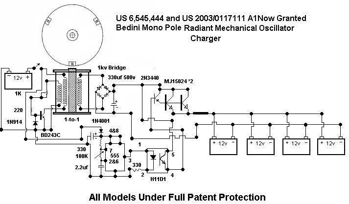 Én még zöldfülü vagyok ebben a Bedini dologban de tegnap sikerült megépítenem egy működő modelt egy használt 24V-os egyenáramú ventillátorból, két 6V-os akksiról próbáltam ki, a ventillátor állórészében van két tekercs amit külön kell csatlakoztatni egymástól, majd kivezetést csinálni neki, és úgy rákötni a rajz szerint az osszcillátorra. Nekem sikerült elinditanom de nem mindegy a tekercsek egymáshoz viszonyított polaritása sem, ki kell tapasztalni mikor inditható be a kerék, akkor jó a kapcsolás ha a motorból magasfrekvenciás hang hallatszik a poti teljes ellenálláson való beállításakor majd kicsit csökkentve az ellenállás értékét a bázisfesültség optimális beállításakor ha kézzel elinditjuk a kereket az magától felpörög és elkezdi a munkát. Majd finoman behangolhatjuk a potival a megfelelő teljesítményre a motort, ezutám már minden indításkor simán erölködés nélkül az első kis lendítésre el fog indulni és beáll az optimális fordulatszámra. A méréseket elvégeztem mindkét oldalon oszcilloszkoppal is és nálam előjött a megjósolt jelalakés tényleg feltöltötte másodlagos akksimat, és úgy működött ahogy leírták. Ha lesz kis időm megpróbálok videót készíteni róla.