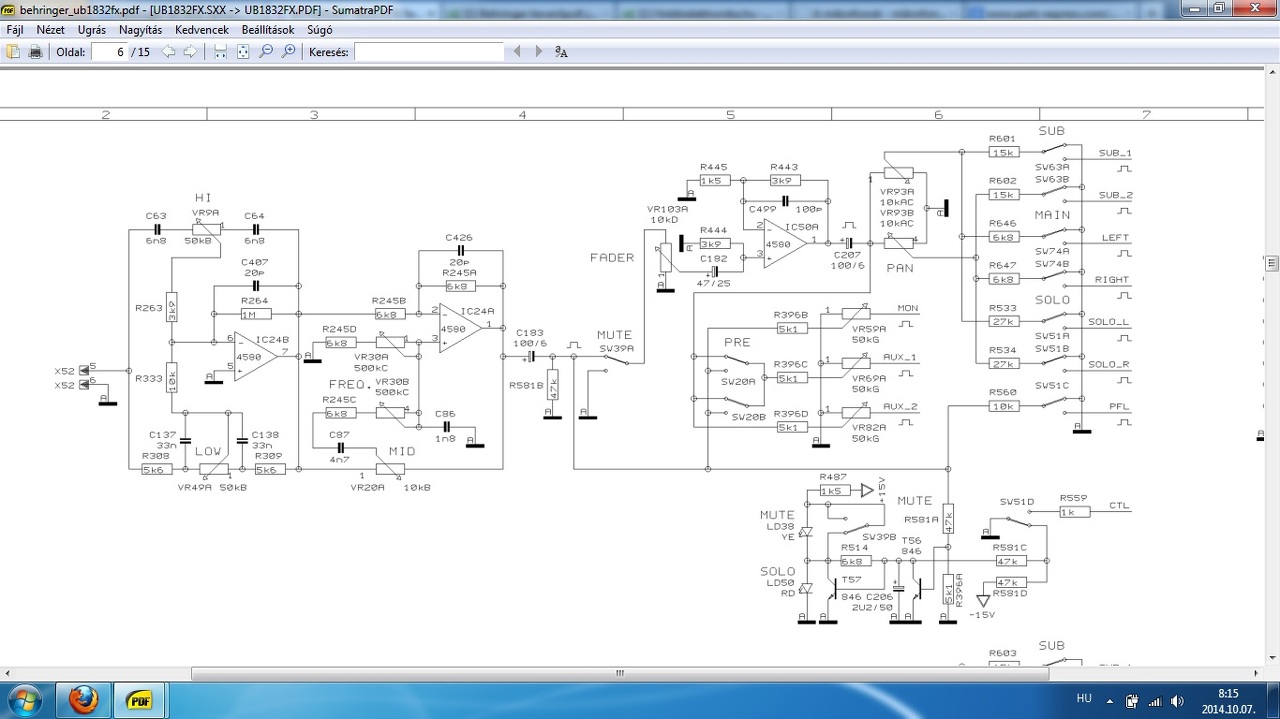 Üdv mindenkinek.. Nemrég hozzájutottam egy behringer ub1832fx-pro- hoz. A hibajelenségek a következőek.. A 2-es 4-es Mic csatornán is szépen fogadja a jelet, csak nem lehet rárakni se a MAIN és a SUB buszokra , a 12/13-as csatornán már csak a 13-ast . És az FX/AUX2 RETURN-ból is csak az egyik csatorna megy ki a buszokra.. A MONITOR buszokon pedig minden jel megjelenik tökéletesen ... Lehetséges hogy ezen csatornák MUTE kapcsolóik Nem adnak át? A MUTE gombok ezeken a csatornákon ha azért bekapcsolom őket világítanak.. És a PFL felé elmegy a jel mivel szépen villog a led a bemenő jelre... PL: a PFL kapcsoló SW 51 C ... PL : A Képen látható SW 39 A MUTE kapcsoló.. Vegy a FADER ás a PAN közt mehetette el valami.. ?