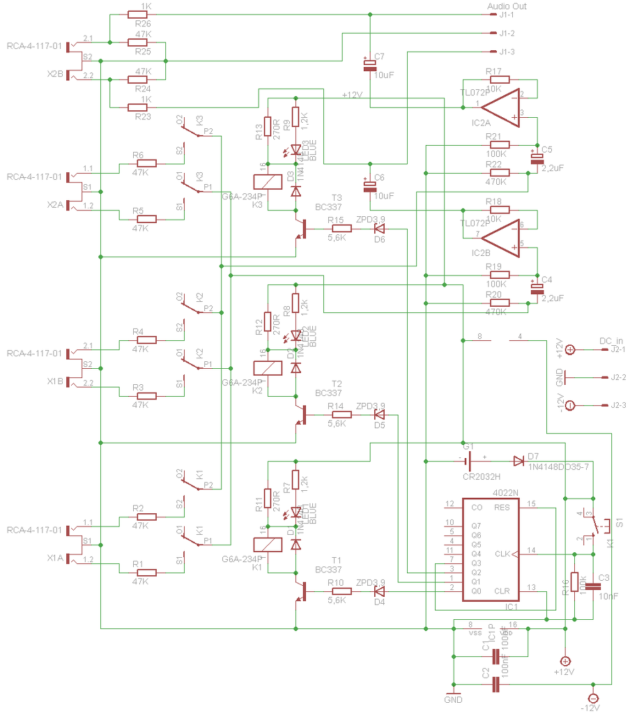 Másik, az erősítő része számomra túl bonyolultnak tűnik, bár szerintem működik, de a bemeneten lévő kondenzátorokat ( ha lehet a kimenetieket is) kicserélném nem elektrolitra. A következő amit eddíg nem vettem észre, még egy dióda nem ártott volna, ugyanis a telepet a műveleti erősítők is fogyasztják.A cd 4022 táplábát kötném egy egy diódával az elemre meg a 12V-ra. Egy szűrőkondenzátor kíséretében.