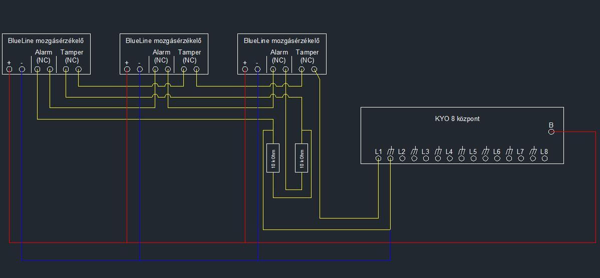 Ha van lehetőség, akkor egy zóna egy érzékelő elvet kell követni. Tehát, ha nincs több zónád, mint 8, akkor ez a legcélszerűbb. A kettős ellenállással lezárt zónáknál nem kell külön tamper kör, azért van a dupla ellenállás, hogy zónánként is lehessen külön szabotázs.
