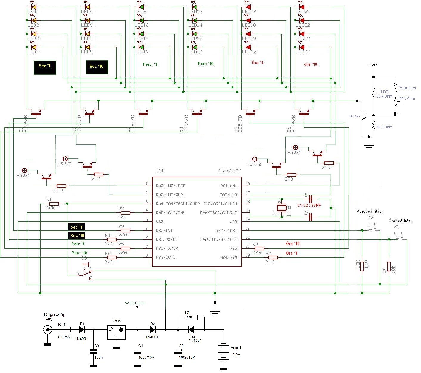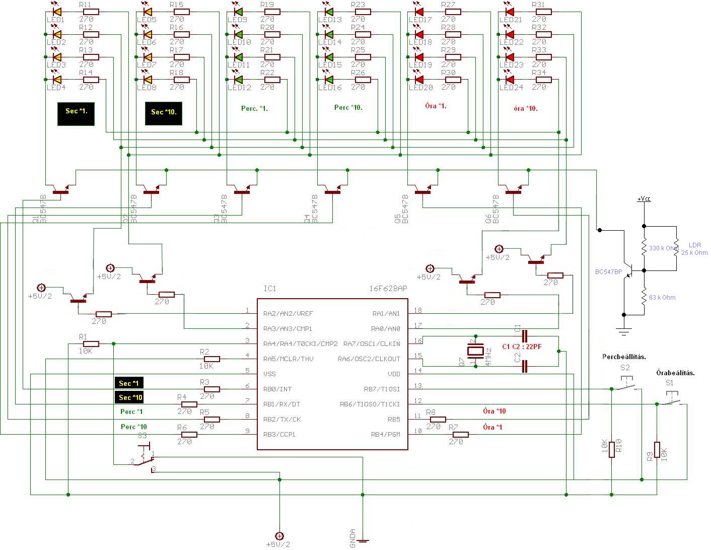 Nem hagyott nyugodni a dolog, ezért elkezdtem kísérletezgetni. Az alábbi módosításra jutottam. A fényerőszabályzás működik, sajna túl jól is, mert sötétben teljesen kihunynak a ledek. Szerintem a ledeknek kevés a tápfesz, talán a multiplexelés miatt. Először csökkentettem az anódellenállásokat, de az sem segített sajna. Kitaláltam, hogy akkor tranyákkal leválasztom a PIC-től, talán így jobb. Ez csak elméleti síkon valósítottam még meg, mert nincs itthon olyan tranyóm. Viszont a fényerőszabályzás megy. Ja, ami még fontos lehet. Nagyfényerejű 3mm-es zöld ledeket használtam. Ha valami szerintetek nem jó a leválasztással, szóljatok. Ja, persze a sok ellenállás nem kell a ledeknél, csak nem töröltem ki őket...