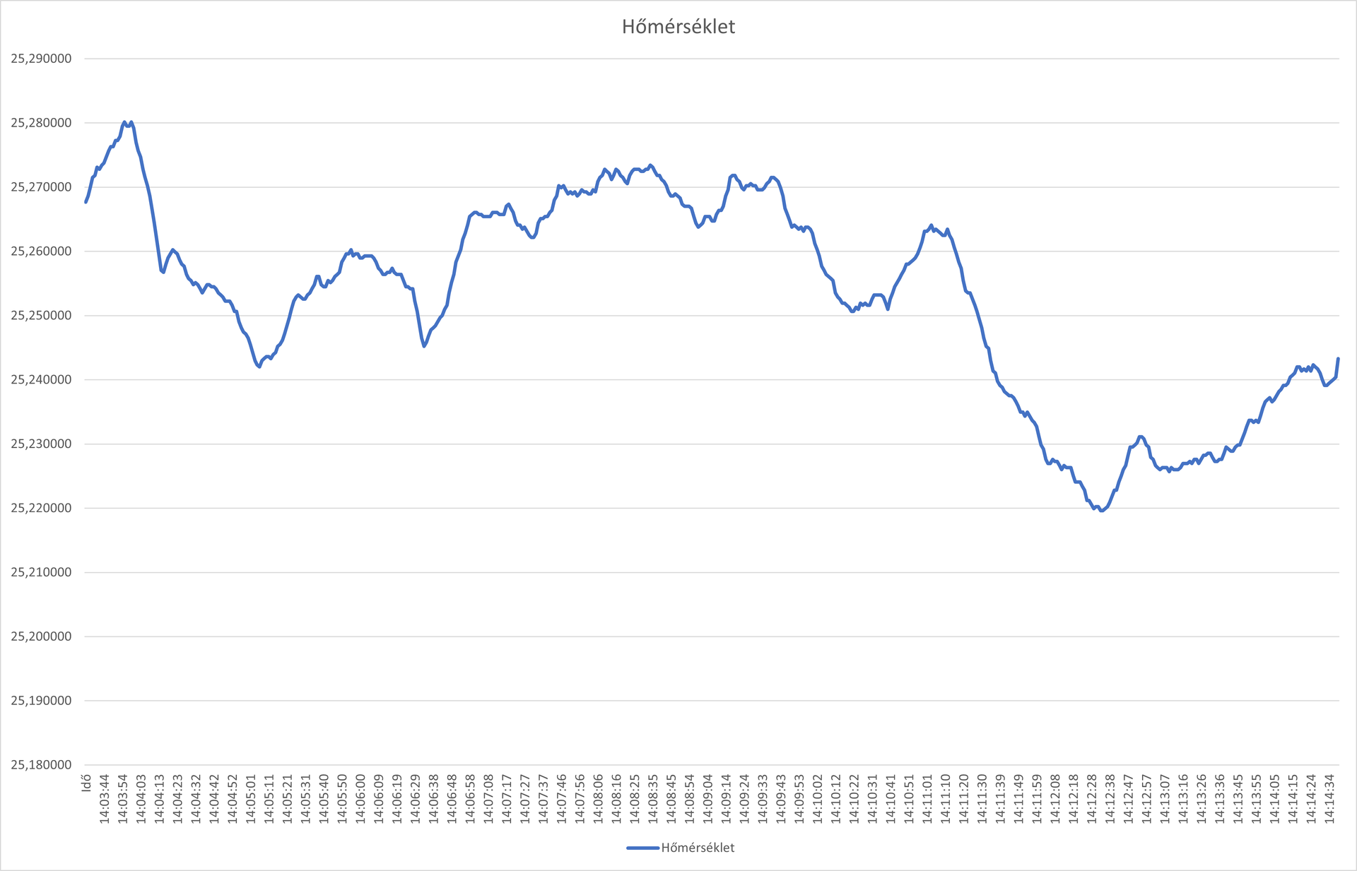 Kábé másodpercenként mértem vele force módban és be volt kapcsolva a VOC érzékelő része is (fűtés 300°C 100ms ideig). A lakásban 24.0°C-ot mutatott a nem túl neves márkájú időjárás állomás. A BME680 így 25.2°C körül mért. Lásd kép. A mérés begyűjtése előtt, előtte ültem. A monitor is közel van hozzá, az RS232-USB adapter is mellé van tűzve a dugdosós panelon. A mérés megkezdésekor otthagytam, hadd dolgozzon. Inkább csökken a hőmérséklet, minthogy nőne. Szerintem ez az érzékelő már jó lesz. Közben látom, hogy BMP280-at használsz és más javasolta a BME280-at. Én eddig erre nem is figyeltem, de én BME280-at próbáltam korábban, az is melegedett.