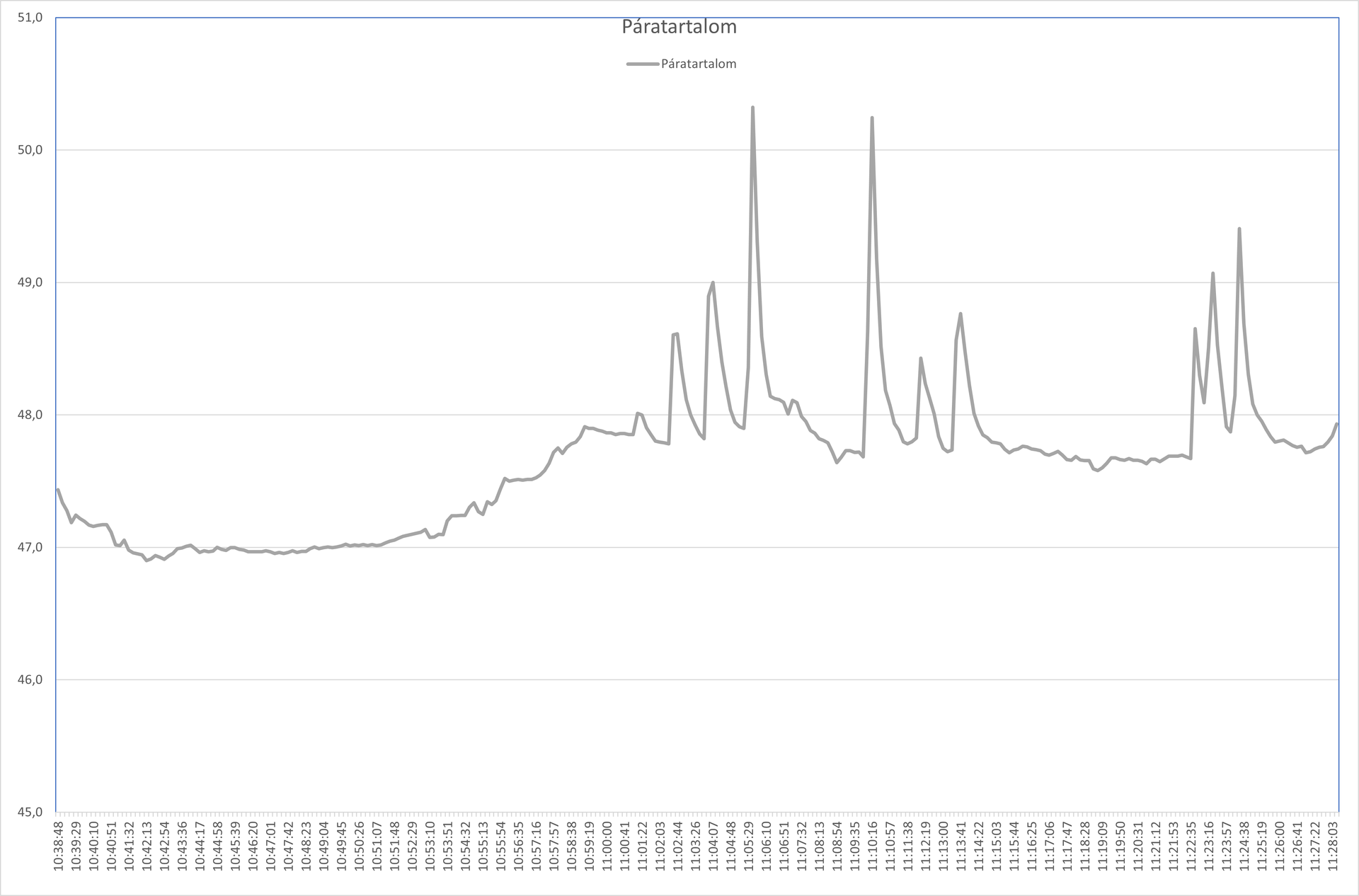 Valakinek talán hasznos lehet még ez is. Csináltam egy 50 perces mérést is a BME680-al, 10 másodperces intervallummal. A hidegindítást próbáltam kivitelezni, amennyire lehetett. Kábé 0.3°C-ot emelkedett a hőmérséklet a bekapcsolástól mérve.