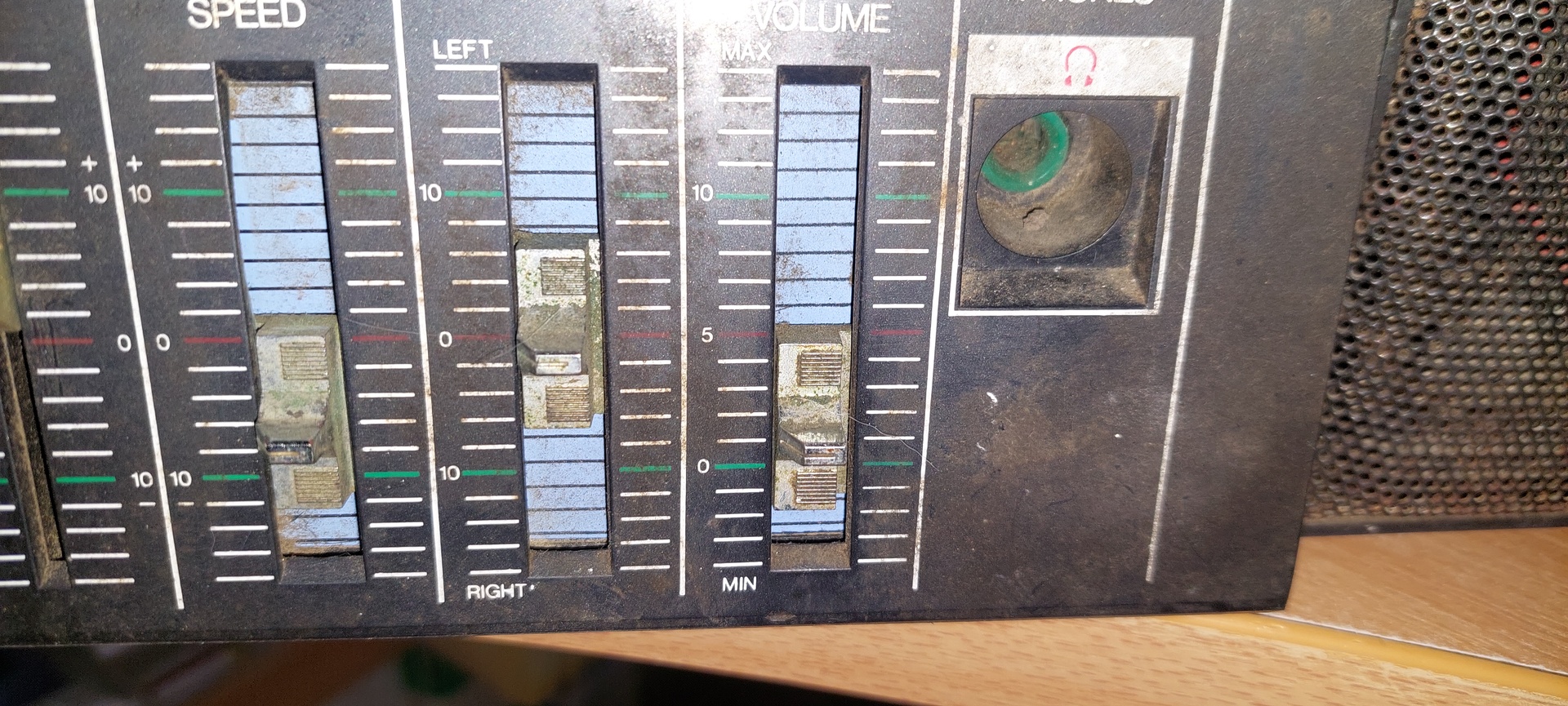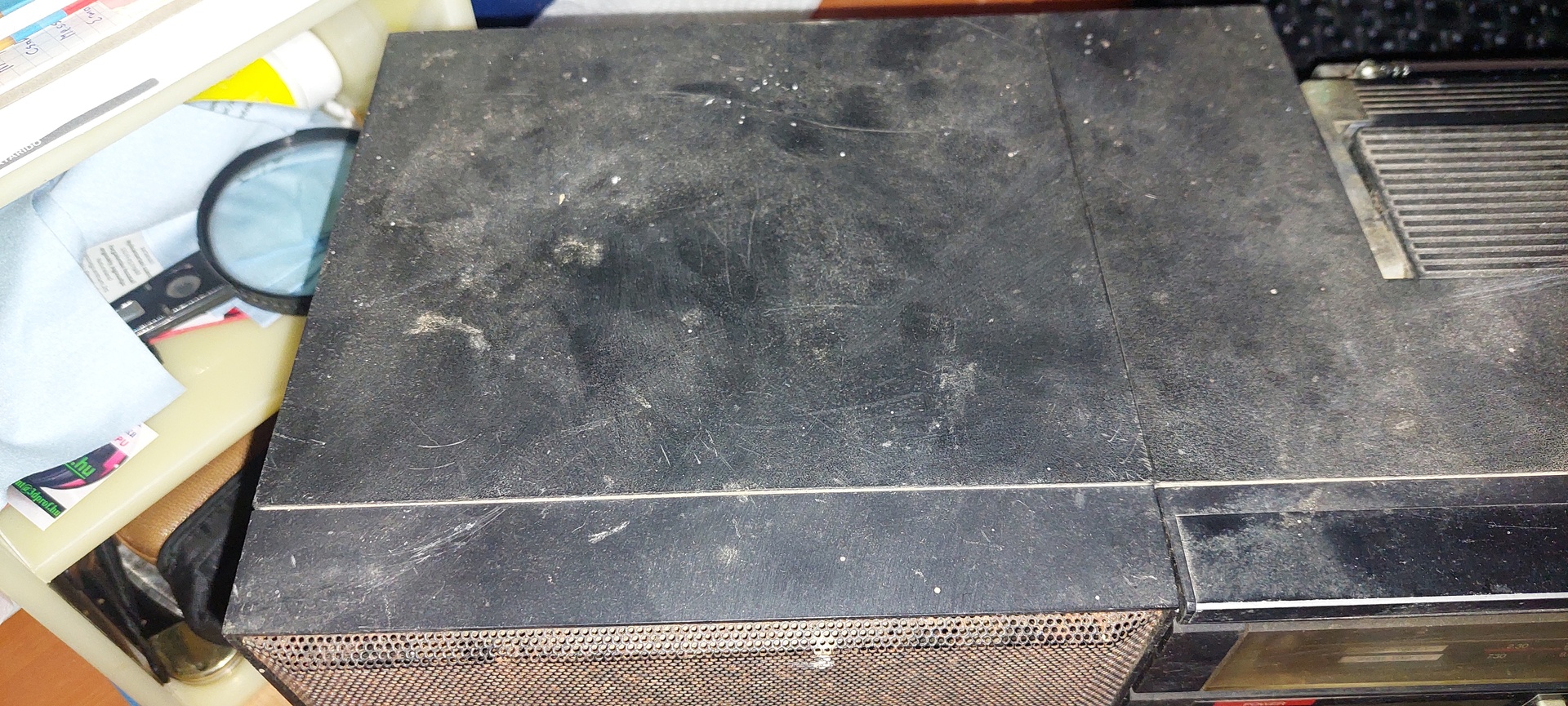 Picit elkezdtem már törölgetni, de szerintem nem erőltetem. Első lépésben szétszedem a hangszórókat és azon legyek túl. Megnézem, milyen állapotban van a pereme. Azt látom lámpával, hogy teljesen ép mindkettő, de mivel 45 éves, lehet hogy be vannak keményedve már. Ha ez fennáll, akkor elküldöm felújításra őket. Utána rámozdulok majd a fő egységre. Azt szét kellene szedni, mert be kell áztatnom és úgy kimosni a zeg-zugokat.
