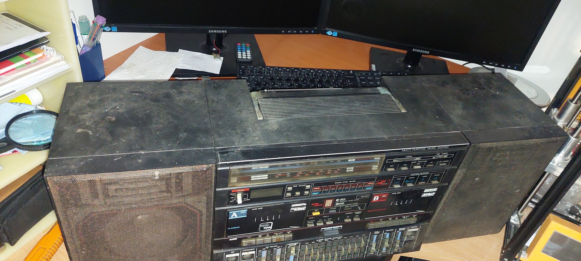 Végre itthon a Boombox. Kezdeti fázisSziasztok!Megérkezett a Boombox. Végre itthon van. Első ránézésre, rettenetes állapotban van sajnos. Másodikra...mondanám, hogy nem annyira, de végülis "annyira". A legnagyobb baja szerintem pillanatnyilag, a rettenetes sok kosz, ami érte ezt a készüléket. Mondhatnám, hogy megért szegény jobb napokat is. Van viszont egy óriási pozitívum az állapotában. Méghozzá az, hogy annak ellenére, ahogy kinéz, nincs sehol külsérelmi nyom, nincs semmi letörve és minden gombja megvan. Ez talán egy közepes alapnak megfelel. Nyilván, újat nem lehet már soha csinálni belőle, de ennél jobban is kinézhet. Potik recsegnek, a balansz szabályozó csak az egyik irányba szabályoz, már gomb nem működik, az órába tettem elemet, egy kis időre láttam működni, de azóta nem. Hát...Először ki kell tisztítanom mindenét és utána meglátjuk. Nem becsülték meg sajnos.