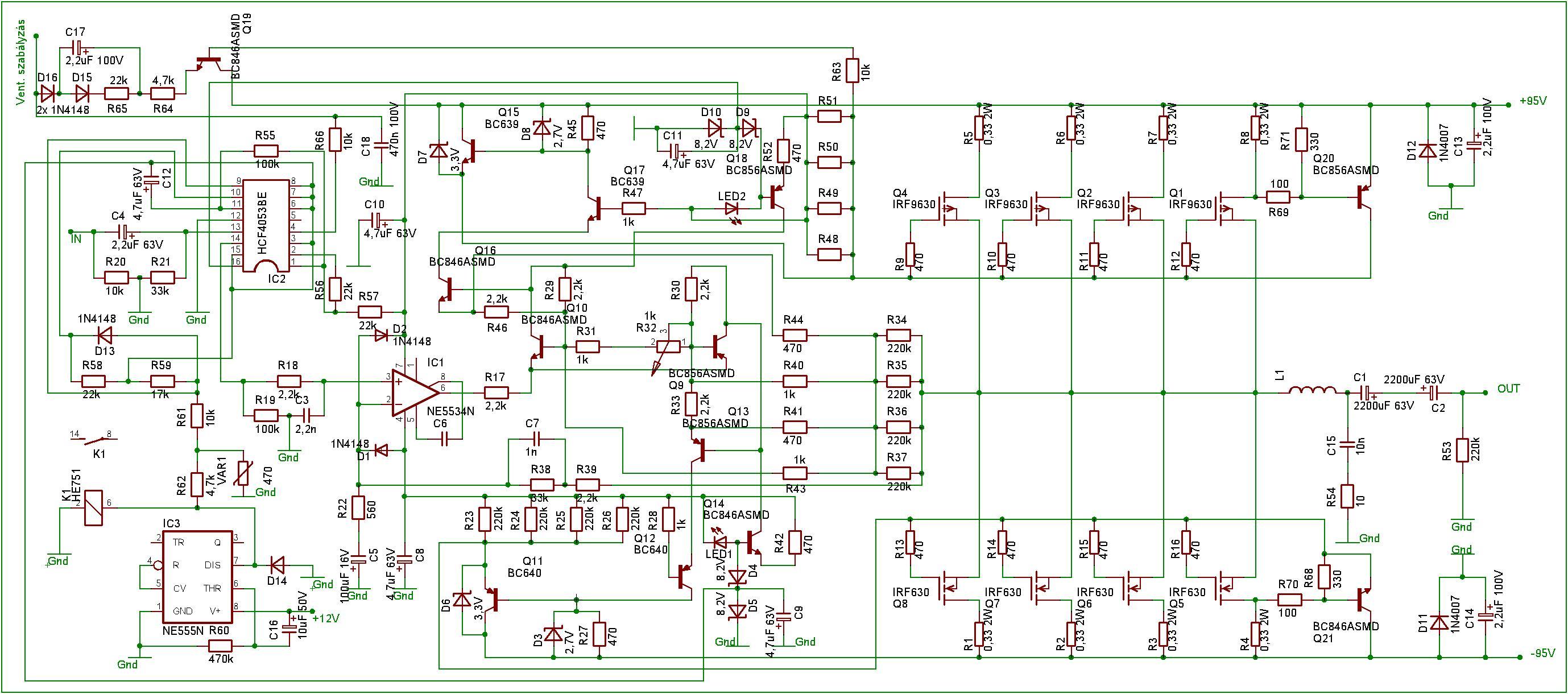 Üdv! Egy Castone CPA-800B erősítőt kellene javítanom, a képen látható hibával hozták. Terheléssel, kb 1/4-ed hangerőn csak a negatív ágban, terhelés nélkül a teljes tartományon, illetve a műv.erősítő pozitiv bemenetén is ki tudom mérni a gerjedést. Megköszönnék egy kapcsolási rajzot hozzá(150W-os, illetve kisebb castone van, de láthatólag nem egyezik), illetve valami segítséget hogy merre induljak el. A tranzisztorokat összemértem a másik(jó) oldallal, és nem volt látányos eltérés, rövidzár, bár nem forrasztottam ki őket. Előre is köszönöm a segítséget!