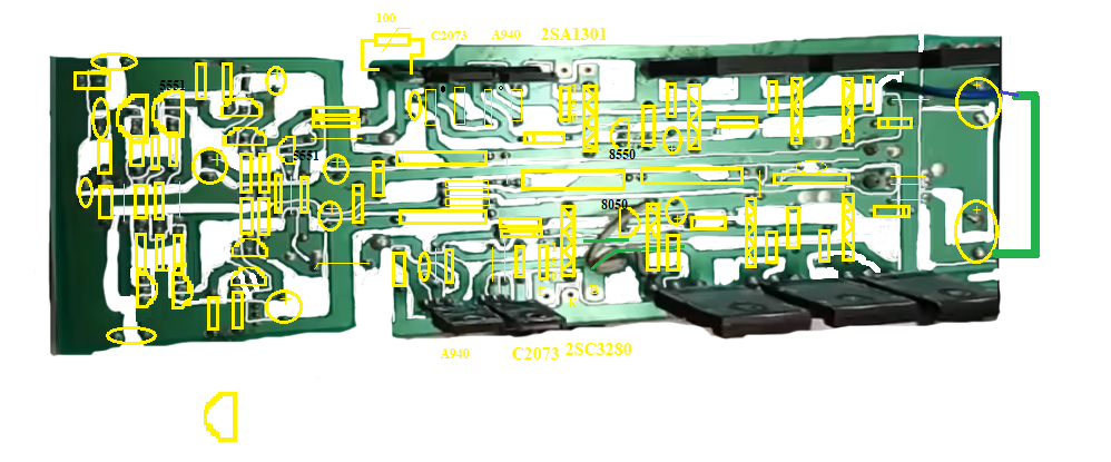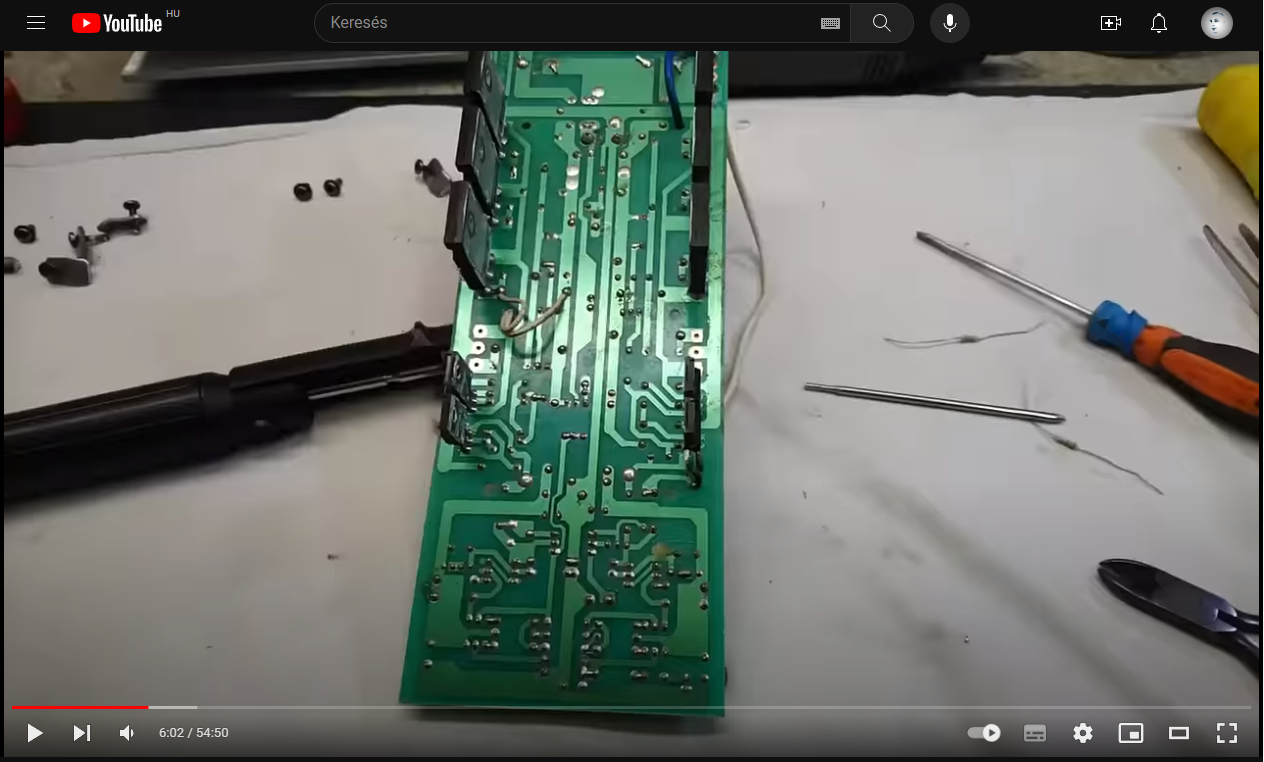 Ebbe a topicba már korábban írtam a Castone CTA-2500P illetve a CTA-3500P kapcsán, szerettem volna kapcsolási rajzot kérni vagy legalább két jó minőségű panelfotót. Nos most ott tartok, hogy egy videó alapján sikerült visszarajzolnom ami szerintem jól is sikerült. Viszont az alkatrészek értékei még kérdésesek és a tranzisztorok polaritásai. A nyákra írt tranzisztor típusok sem egyeznek azokkal amik be vannak építve, ez a nagyobb tranzisztoroknál még látszik is mint pl.: - Nyákra írt típusok: C2073, A940, 2SA1301, 2SC3280 - A beszerelt tranzisztorok: C5171, A1930, 2SA1943, 2SC5200. Vélhtően a nyákra írt kisebb tranzisztorok típusai is eltérnek a ténylegesen beépített típusoktól. Amely típusok a nyákon látszódnak a videóban azokat fel is tüntettem a visszarajzolt rajzon, ezek az alábbiak: 5551, 8550, 8050. Tudna valaki segíteni a pontos értékek beazonosításában illetve a kis tranzisztorok megfelelő típusának a megválasztásában? Megköszönném azt is, hogy ha a visszarajzolt rajz helyességét meg tudnátok erősíteni vagy hiba esetén korrigálni. Ezekről a Castone típusokról sajnos nem találni semmit a neten. A videó amely alapján visszarajzoltam itt található. Előre is köszönöm a segítséget!