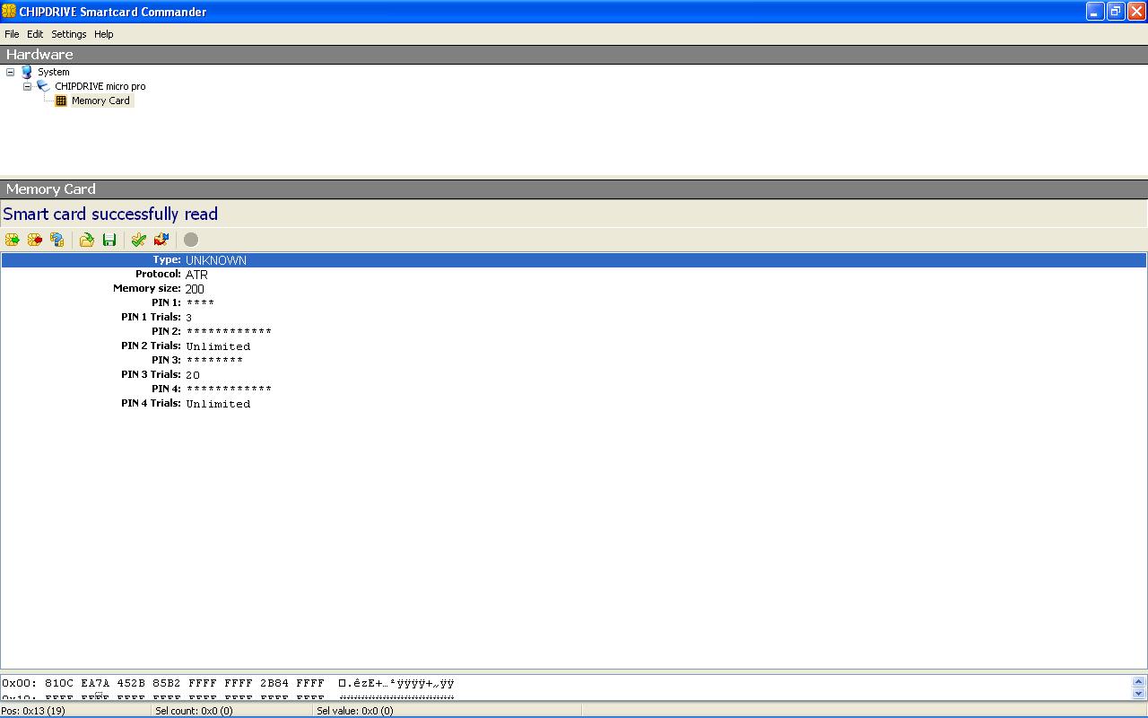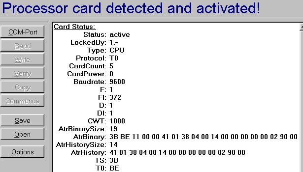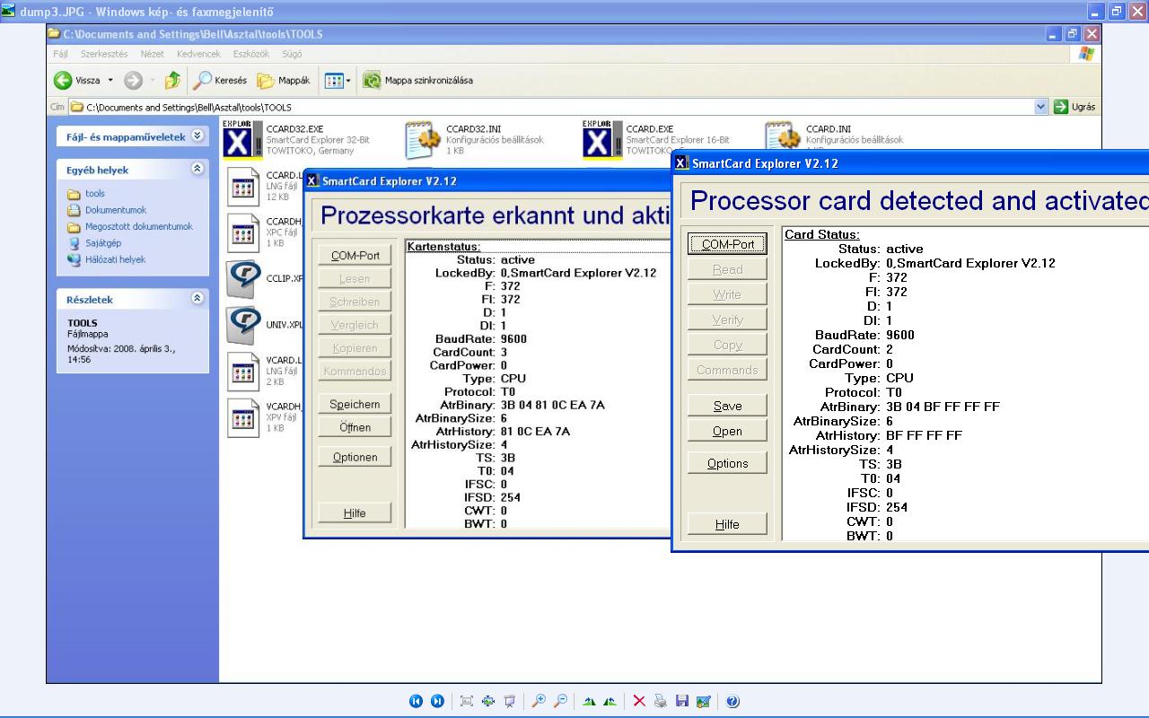 Érdekes hogy minden új olvasásra más adatokat ad! Még érdekesebb hogy a chipdrive programja is felismeri mint cpu card ha a ccard32.exe fut. képeket mellékeltem üdv nnna... most jön a kRoy által említett rész: bármi lehet. nem egy 'tipikus' valamely kártyára egyértelműen utaló a kapott atr. sajnos innentől passzolom. (esetleg ha ötletelni kellene, akkor valami pkcs11 alapú kliensazonosító kártyára tippelnék -pl mint az apehkártya- de sokra ezzel az észrevétellel sem jutsz, mert ha nem egy ismert alapkártya, akkor nulla dokumentációt lehet hozzá találni) az olvasásokból adódó eltérés valószínűleg (100%) nem a kártya miatt van. vagy kontakthibás az olvasó, esetleg nem stabil a kártya tápellátása, vagy valami program fut a gépeden háttérben ami 'bezavar'. (pl valami telefonos program, vagy bt program folyamatosan szkenneli a portokat. ilyesm. ezek furcsa dolgokat tudnak művelni kártyázás közben. meg az usb csatolás sem a legszerencsésebb ehhez a tevékenységhez, az xp csapnivaló portkezeléséről meg már nem is beszélve) a lényeg: a kártyának resetre mindig ugyanazt a karaktersort kell adnia.