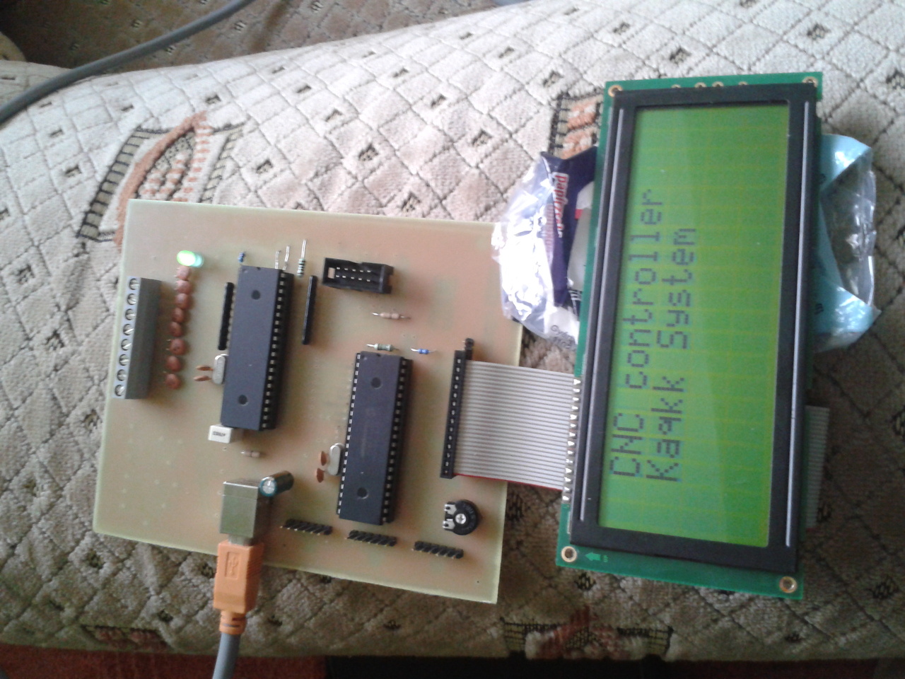Kezd alakulni a vezérlőpanelom . A cncusb programhoz készül az usb-s pic 18f4550 és ő működik együtt a pc-vel és gyártja a step-dir jeleket .A másik 16f877 es és ő csinál a step-dir jelekből emészthető kimenetet a motormeghajtó hidaknak + a kijelzőt kezeli .