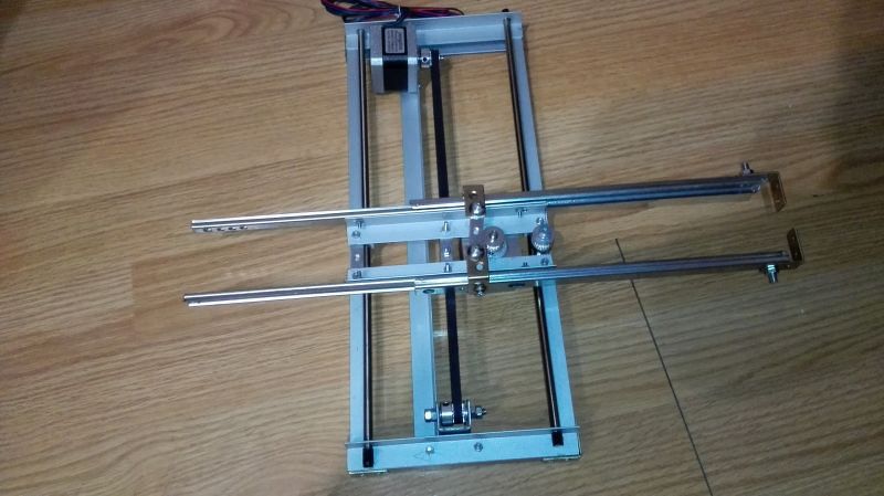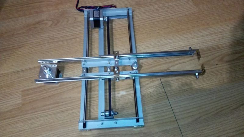 Az alsó alumínium keret fix, azon mozog az egész fölső rész annak motorjával együtt (a kép szerint fel-le) -az az X tengely. Ami most a képen vízszintesen van az mozog (kép szerint) jobbra-balra, és a végére kerül (jobbra) majd a filctoll/toll esetleg lézer modul.