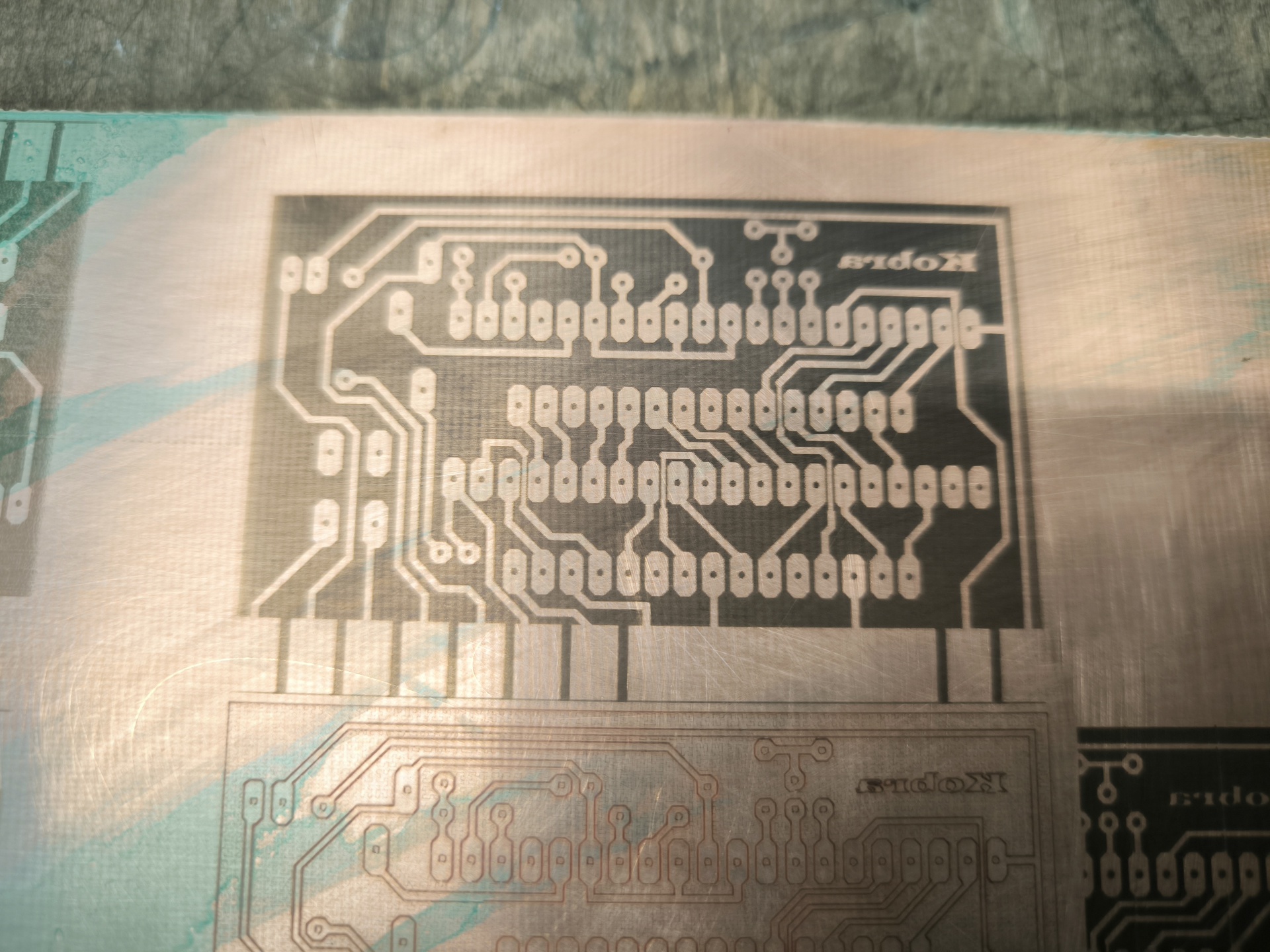 Szerintem csinálj először negatívot a képből, mert így pont a vonalakat és forrpontokat maratod le, a szigetelő részen meg ott marad festék alatt a réz. Na meg tükrözni sem ártana (ha a terven jó a felirat iránya), mert a felirat is tükrözve van.